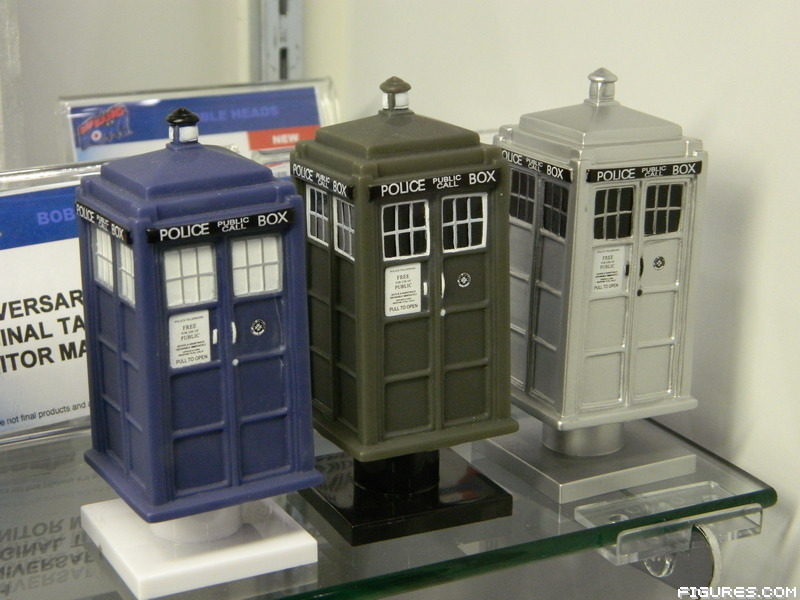 On the collectibles side there were quite a few fun “kitchen” products like standard and travel mugs, water bottles, color-changing TARDIS glasses, and more with special designs for the anniversary including the eleven Doctors and the TARDIS. Bif continues the Doctor Who bobbles as well this year with Daleks, Doctors, Davros, large and small “Monitor Mate” TARDISes including the iconic craft in various colors (traditional blue, a monochrome version capturing its look from the early days, and chrome in honor of the anniversary). Other items include journals, diaries, shot glasses, and coasters like a very cool set that has all 11 Doctor Who logos!