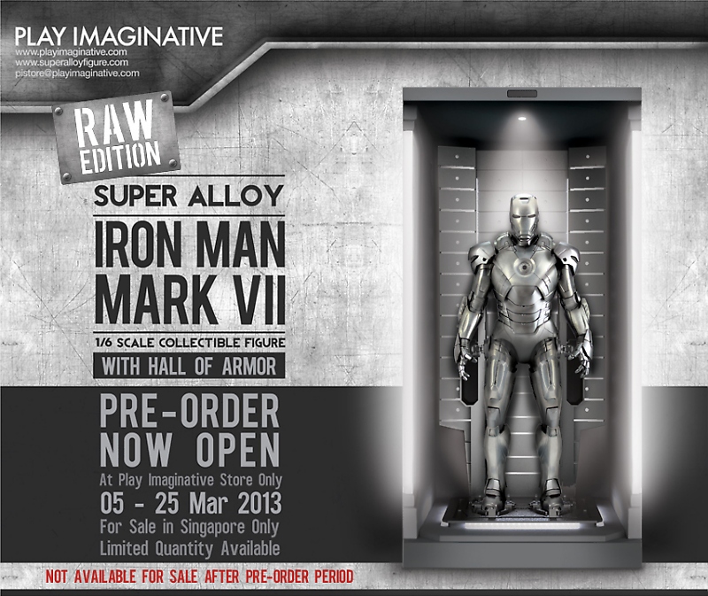 The Super Alloy Iron Man Mark VII RAW Edition with Super Alloy Hall of Armor is priced at $400 SGD ($321 USD). Full details on how to order one from Singapore can be found at playimaginative.com/SuperAlloy_IronManMk7_RAW/. Keep an eye on BigBadToyStore.com for pre-orders as well.