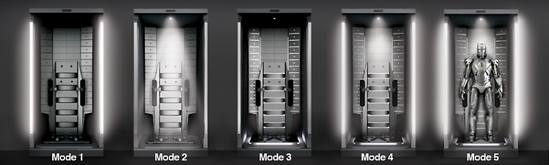 The Super Alloy Hall of Armor is constructed with a die-cast metal back interior and base. It features battery operated lights (batteries included) with 5 different lighting modes to choose from. An included infrared remote control operates lights for ease of control within display cabinet.