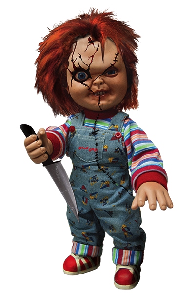 Mezco Toyz presents the star of five Child's Play films: Chucky. Standing 15" tall, Chucky features real cloth "Good Guys" clothing, 11 points of articulation, trademark orange hair, realistic glass-like eyes, and a knife that he is sure to use for no good. Each Chucky comes packaged in his own collector friendly window box and will be on store shelves in September 2013. He is available for pre-order at finer online retailers now priced at $90.