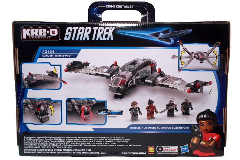 Straight out of the summer film STAR TREK: INTO DARKNESS comes the Klingon Bird-of-Prey Star Trek KRE-O building set. This building set is compatible with LEGO and other similar types of construction blocks but are Hasbro’s very own brand. The Klingon BOP is a middle of the line set that includes the one vehicle and four minifigures called KREONS: Captain Kirk in Civilian Gear, Uhura, and two Klingon warriors. If you’re keeping track of the KREON blind pack figures, yes, this is the same Klingon figure found in that assortment.