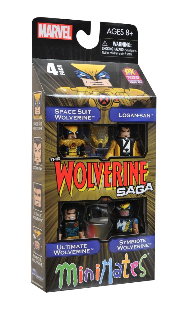 Diamond Select Toys gives fans a closer look at their San Diego Comic-Con exclusive Marvel Minimates Box Set. Now titled "Wolverine Saga," this set includes four different Minimates spotlighting different moments in Wolverine's life. Symbiote Wolverine depicts the New Avenger when he was possessed by a Venom clone, Spacesuit Wolverine shows him in his frequently utilized space armor, Ultimate Wolverine is his well-known Ultimate Universe counterpart and Logan-San in Japanese Robes shows him circa his engagement to Mariko Yashida.