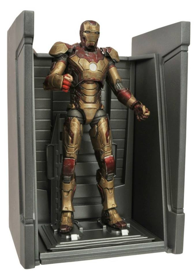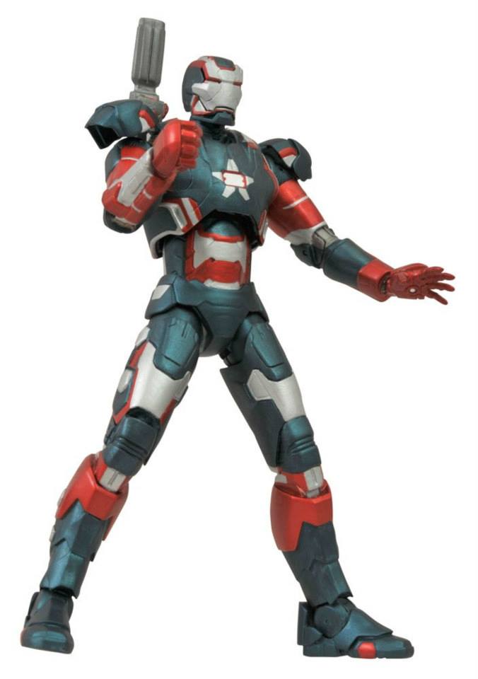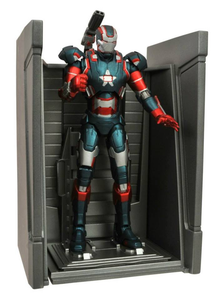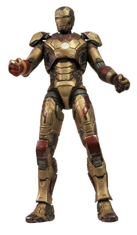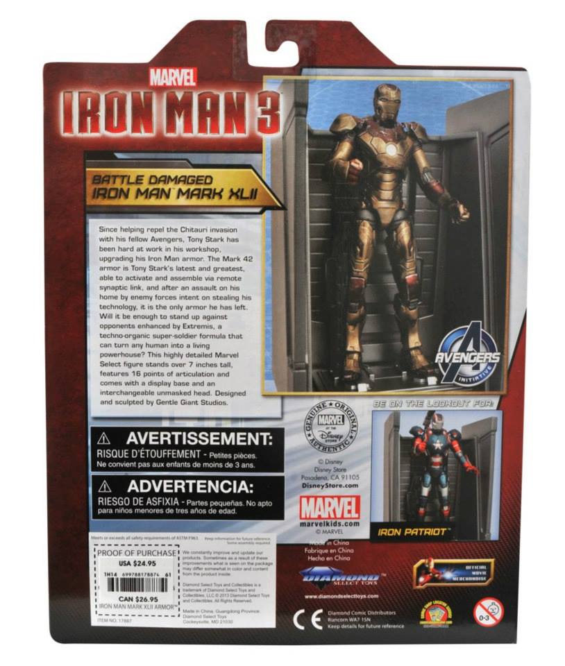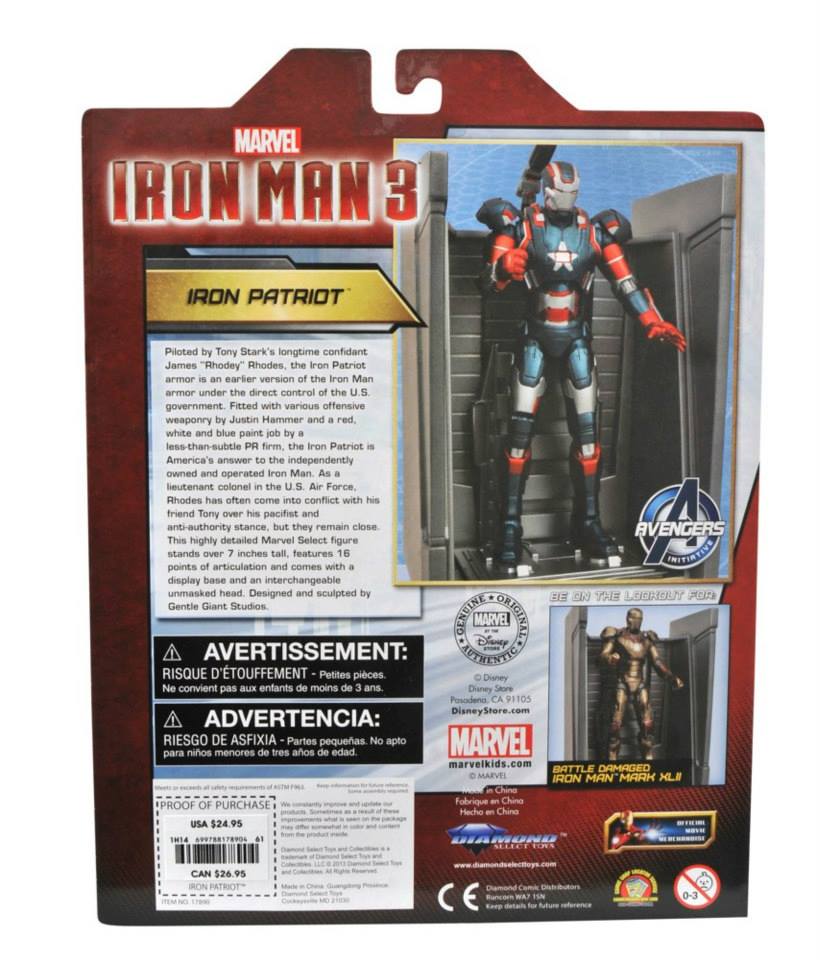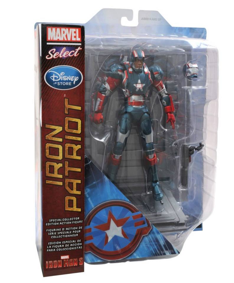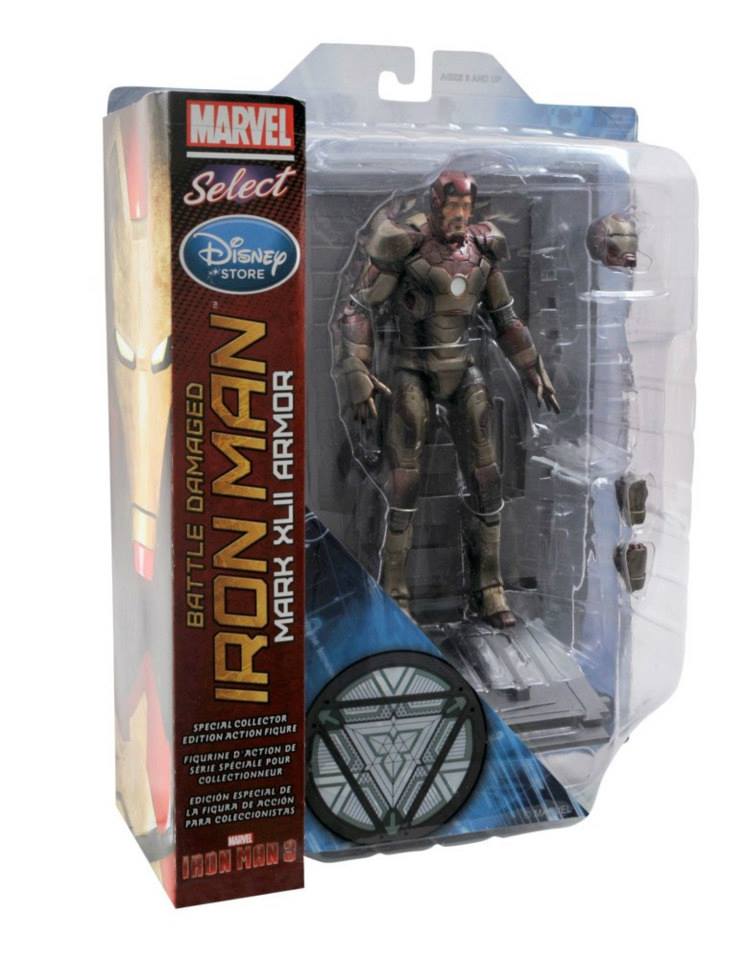 Diamond Select Toys expands their Iron Man 3 Marvel Select series with two new additions. Joining the standard release of Iron Man Mark 42 and War Machine (see HERE) comes two Disney Store exclusives: Iron Patriot and Iron Man Mark 42 (Battle Damaged). Iron Patriot includes a removable, articulated shoulder cannon, an interchangeable maskless head featuring the likeness of actor Don Cheadle, and an armor bay for displaying your figure. The Battle Damaged MK42 features interchangeable fists, an interchangeable unmasked head with the likeness of Robert Downey Jr. and an armor bay identical to the Iron Patriot's, so you can display your figures side-by-side in your own personal armory. Both figures stand approximately 7 inches tall and star 16 points of articulation.