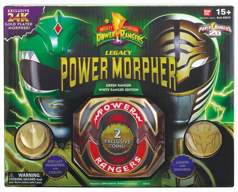 Mighty Morphin Power Rangers fans, be the first to own the Legacy Power Morpher in a Green Ranger / White Ranger Edition! This Limited Edition is 24 Karat Gold plated and comes with two Diecast medals.