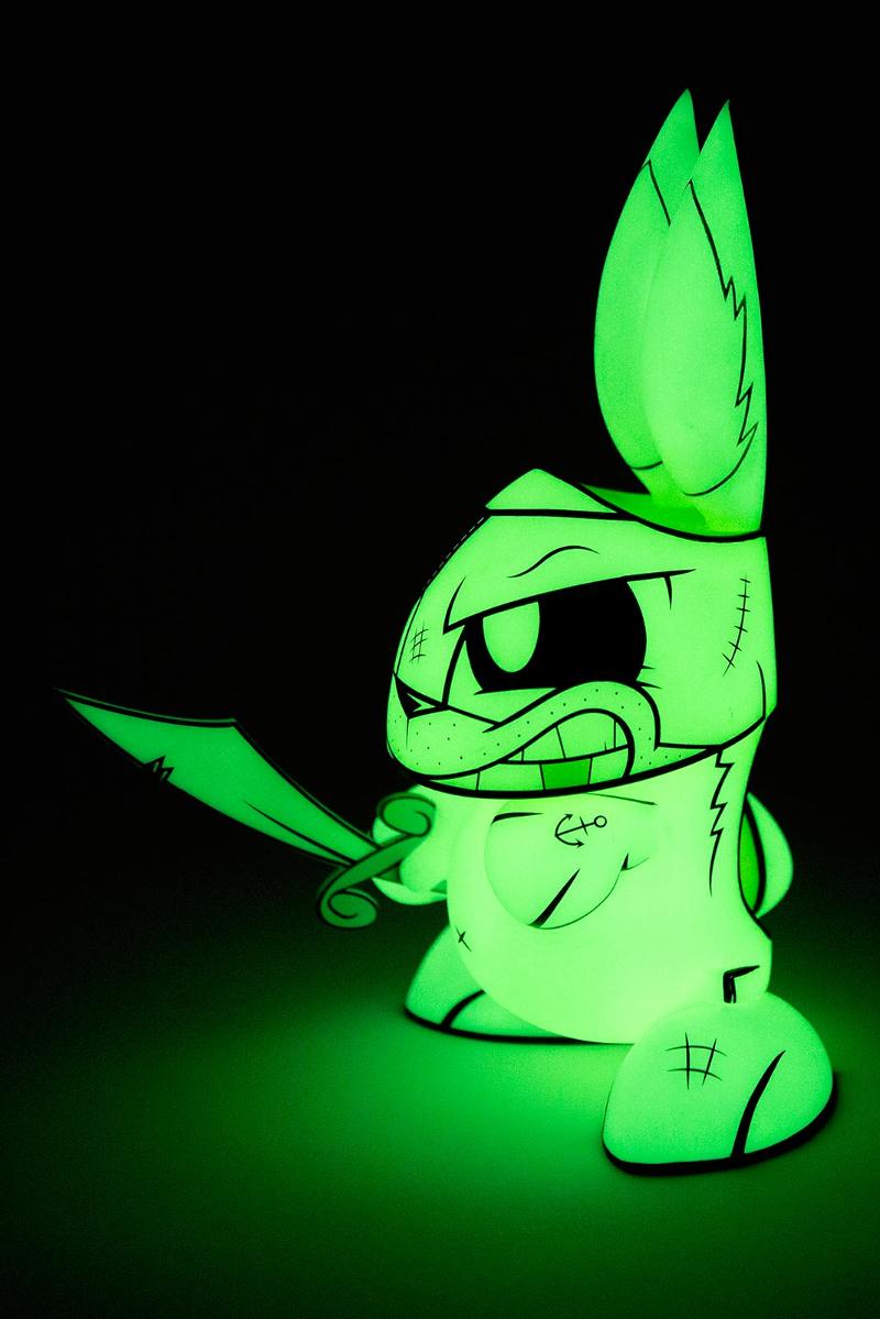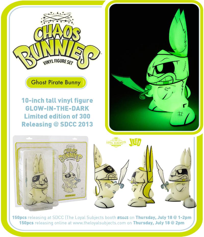 The Loyal Subjects' Chaos Bunny vinyl figure set continues with the release of Ghost Pirate Bunny. Not only is this tattooed, one-eyed, buccaneer of a bunny is ready for action with his articulating arm and sword, but he comes from beyond the grave and glows-in-the-dark. A 10-inch vinyl figure, Ghost Pirate Bunny is produced by The Loyal Subjects, and comes packaged in a fantastic jumbo-sized (and re-sealable) blister pack, and will be available for a yet-to-be-determined price.