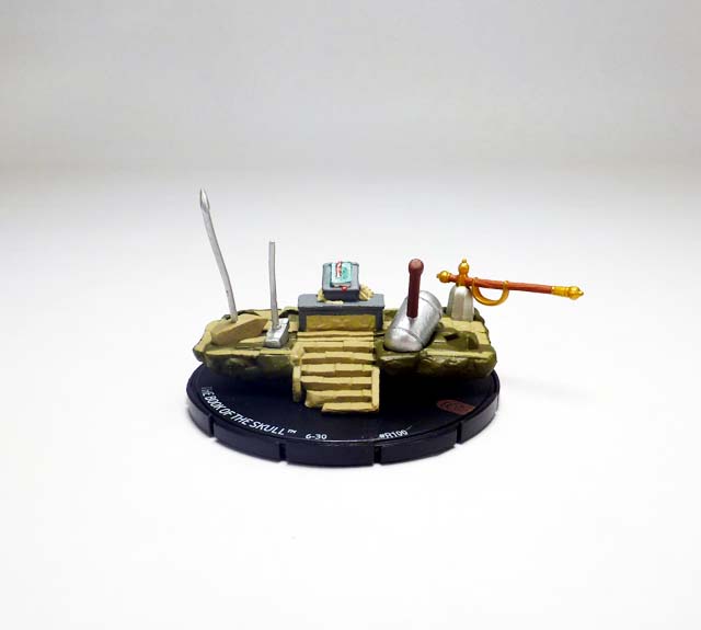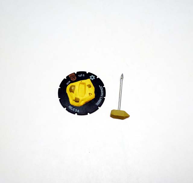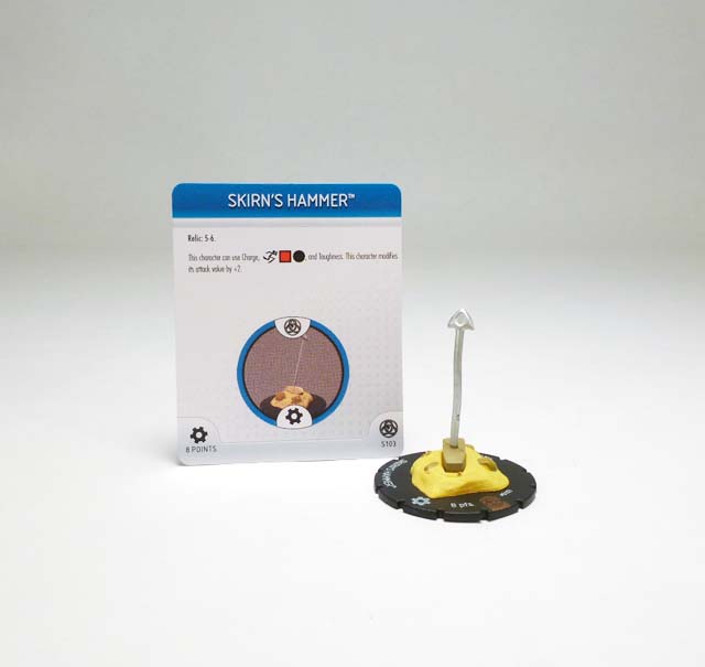 An 8 point relic like the others, this hammer has a large geometric tan head with a flat end and a pointed end and a silver shaft ending in a barbed triangular point. Meanwhile, the base is a mound of yellowish sand with protruding rocks in it. It takes a roll of 5-6 for a character to pick up Skirn’s Hammer, and when it does so gets Charge, Improved Movement: Ignores Elevated Terrain and Characters, Toughness, and +2 to its attack! And just like with the others you can add Skirn’s weapon to the Book of the Skull resource dial to make it even more deadly.