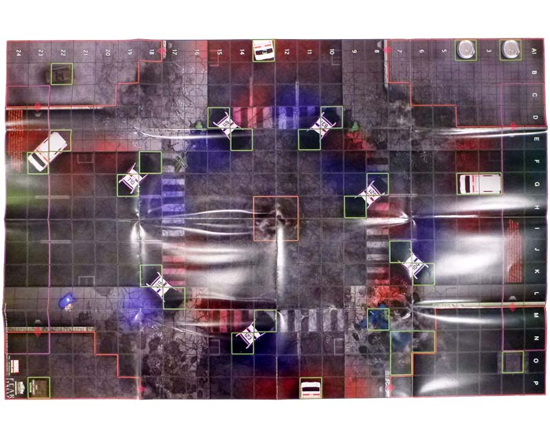 On one side of the Month 3 Fear Itself map you’ll find a spot that’s very familiar to Fantastic Four readers, New York City’s Yancy Street! Home of the Thing and a place he references frequently, Yancy Street is usually just like any other... but not during Fear Itself. For that is where one of the Serpent’s hammers fell, and where Benjamin Grimm was transformed from the Thing into Angrir: Breaker of Souls. The map is an intersection of Yancy and Colfax with streets leading off all four edges (and which could be connected indefinitely with more copies!). At each corner of the map is an elevated terrain building that includes a handful of squares of hindering terrain. Meanwhile, near the center of the map is a ring of hindering terrain police cars along with some ambulances and the wreckage of a helicopter. At the very middle of the map is a four-square section of orange, the “Angrir’s Hammer Impact Zone.” Here either player can place the upcoming Angrir’s Hammer 3D object, and while it’s there characters within six squares of the zone can’t use Support or Regeneration!