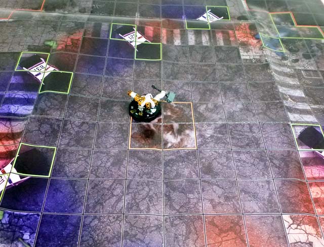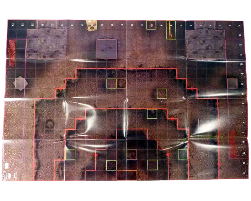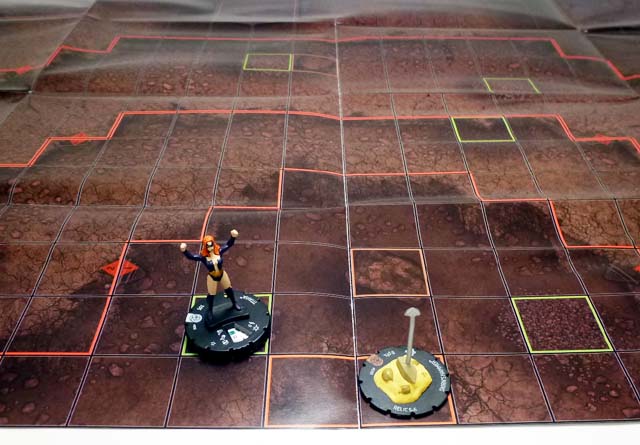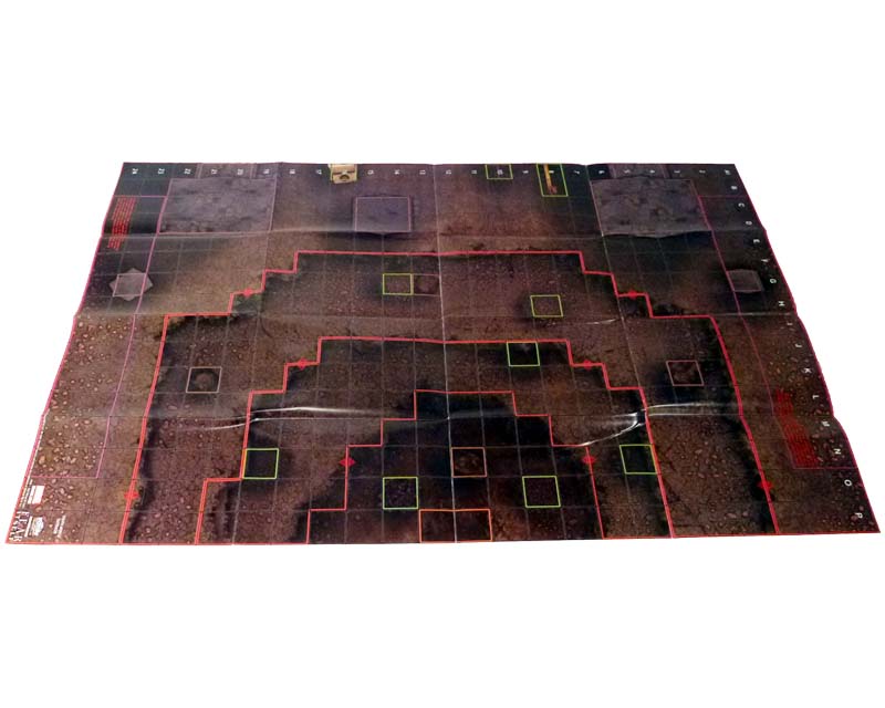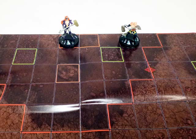 The other side of the Month 3 map takes us all the way to South Africa, and more specifically a mining operation where Titania and Absorbing Man were “working” when the Serpent started his rise to power. One half of a deep crater, the short sides and numbered long side form the ground level (Level 4 on this map!) where you’ll find blocking terrain buildings and hindering terrain mining equipment. From there the levels drop steeply toward the center of the edge opposite the numbered side all the way down at Level 1. Along the way each layer of Earth has at least a couple of squares of hindering terrain in the form of debris, and most have some blocking terrain rubble as well. This map will definitely serve as a challenge to figures without flight, Leap/Climb, or other special movement, and like its flipside will work great with a second copy to join to make a full crater. At the very bottom of the pit are two squares of special orange terrain (four if you link up two maps) called “Skirn’s Hammer Impact Zone.” Either player can put a Skirn’s Hammer 3D object there, and while it is no figure within six squares of the zone can use Outwit!
