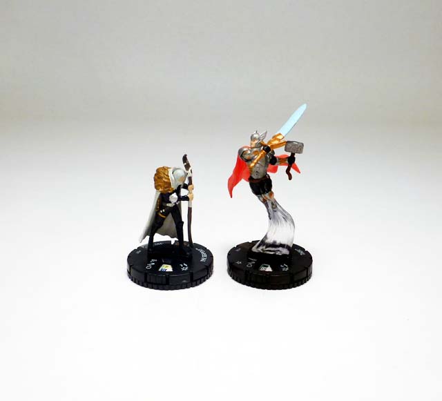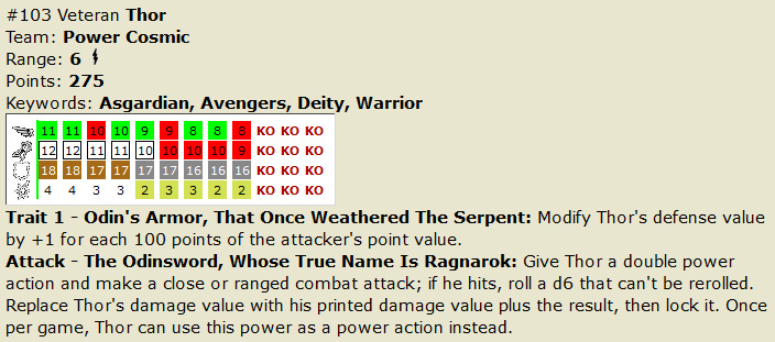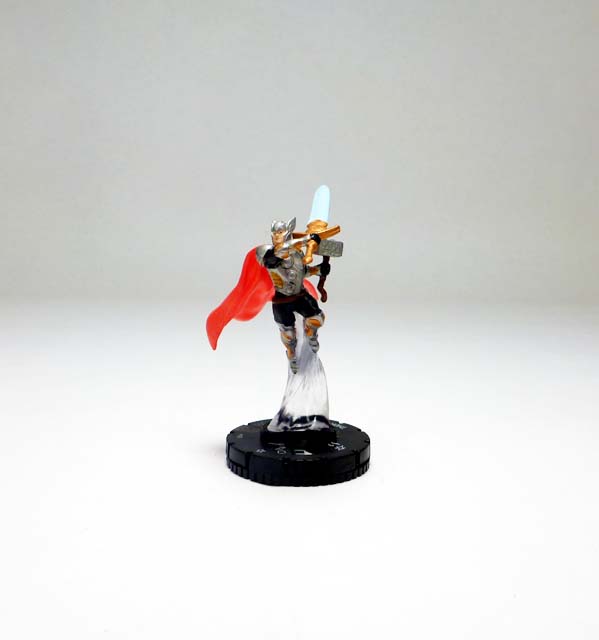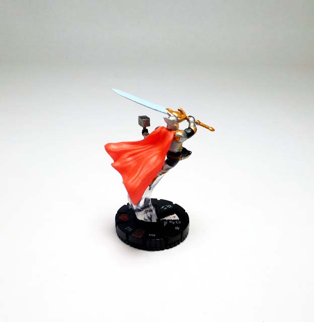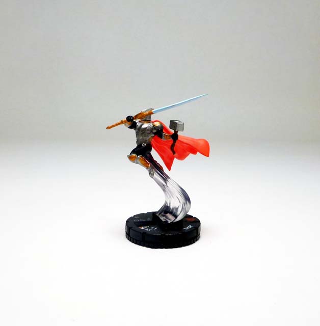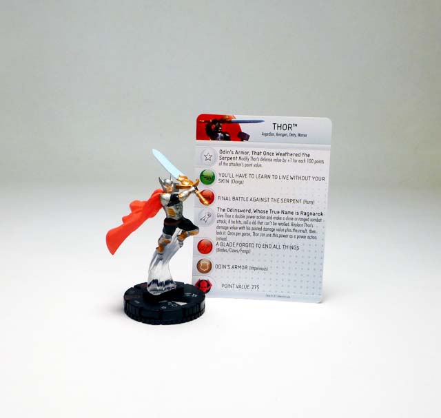 As most players will know, the son of Odin has been clixed quite a few times in the past, with a recent appearance in the TabApp line and two figures in the Marvel HeroClix 10th Anniversary set. With a range of Thors in the past representing various points in his superhero career the figures have come in at a variety of point costs, and this new version is one of the most powerful yet (only surpassed by the godly Mighty Thor, duos with Hercules or Loki, and the one riding his Mighty Chariot). Armored Thor is 275 points and is worth every one with the Power Cosmic team ability, 6 range, and a Trait that increases his defense by +1 for every 100 points of an attacker’s point value! A nine click dial features solid stats and an array of powers that focus on brutal hand to hand combat like Charge, Flurry, and end dial Blades/Claws/Fangs and Exploit Weakness. Defensively, he’s protected by nothing less than Invulnerability, and that only after four clicks of un-outwittable Impervious. But let’s face it, you’re here for the special power. “The Odinsword, Whose True Name Is Ragnarok” gives you the epic ability to roll a d6 and add that number to Thor’s printed damage! Now, this is tempered somewhat by it requiring a double power action, though you can use it once per game as a regular power action. Thor teams up best with fellow Asgardians, Avengers, Deities, or Warriors in high point games, and I can’t wait to send him up against the Serpent to recreate the final Fear Itself battle.
