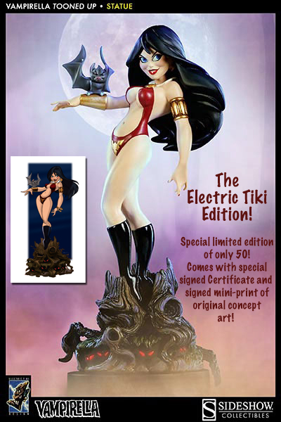 Electric Tiki writes in to inform fans - that while they have taken a break from producing product for a while -will be releasing an exclusive version of their "Tooned-Up" Vampirella statue. Although this statue was 100% produced by Sideshow Collectibles, Electric Tiki designed the piece and oversaw the production.