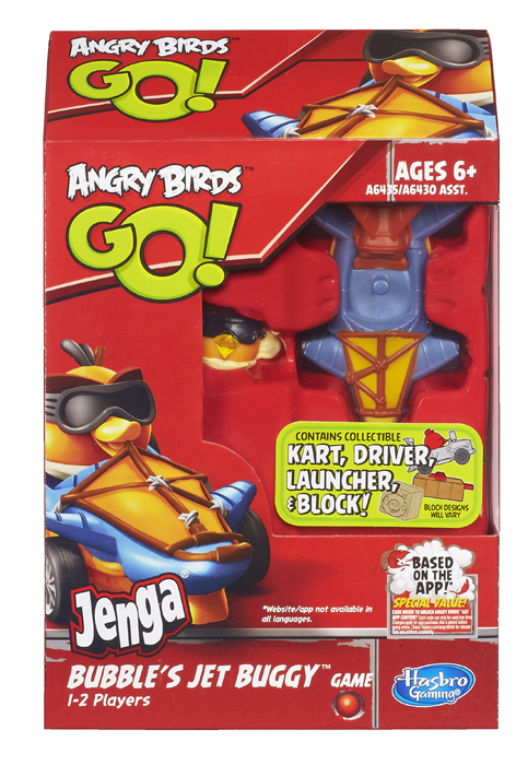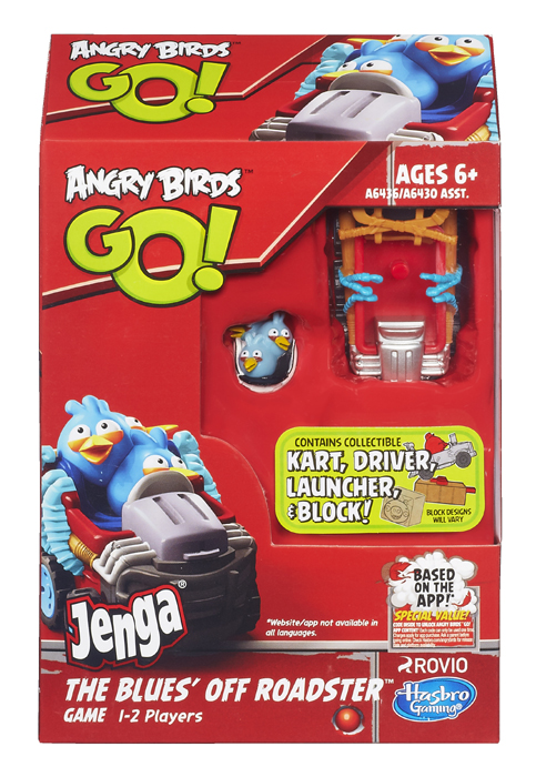Collect all six ANGRY BIRDS GO! JENGA ROWDY RACERS characters to use throughout the ANGRY BIRDS GO! JENGA line. Each collectible character comes with its own kart, launcher and JENGA blocks to send the kart crashing! Players can also unlock ANGRY BIRDS GO! in-app content with a special code in each pack.