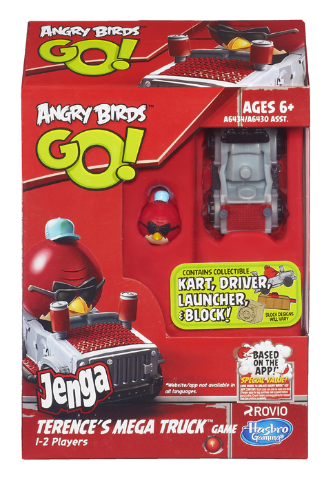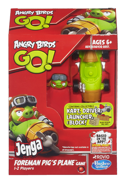 Stack up your tower in the new ANGRY BIRDS GO! JENGA TOWER KNOCKDOWN GAME. Send your kart flying to knock down the tower and capture the pigs. Players can also unlock ANGRY BIRDS GO! in-app content with a special code in each pack.