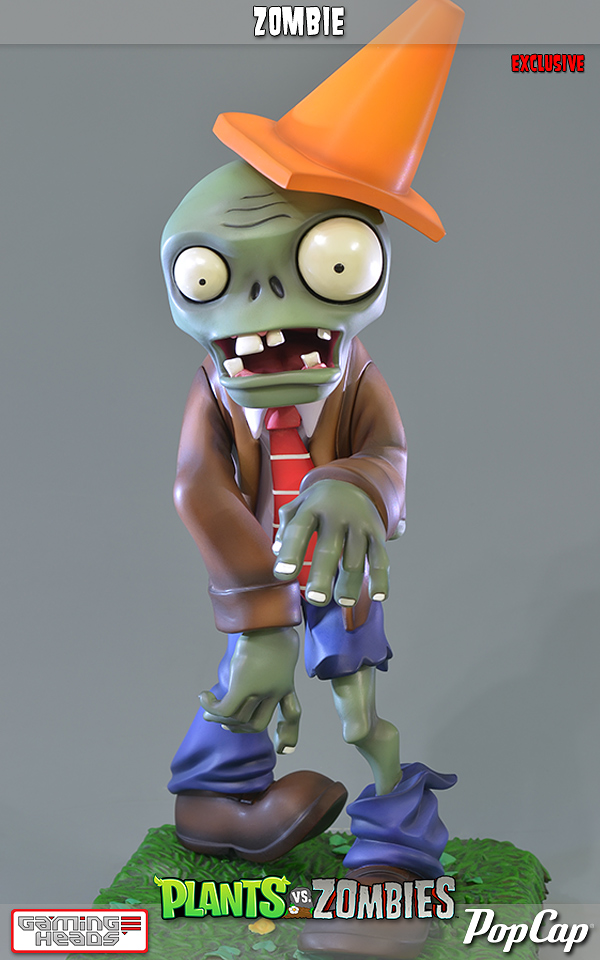 Captured in PopCap's signature style, this zombie figurine stands on a tile of grass from the game, slowly but surely trying to make his way towards another home to invade! This 13-inch Zombie statue is cast high quality polystone. The regular edition is limited to 750 pieces and is priced at $139.99. A Conehead Zombie is the exclusive edition, the comical walking undead limited to 350 pieces and priced at $149.99.