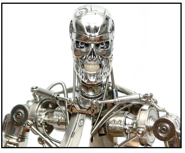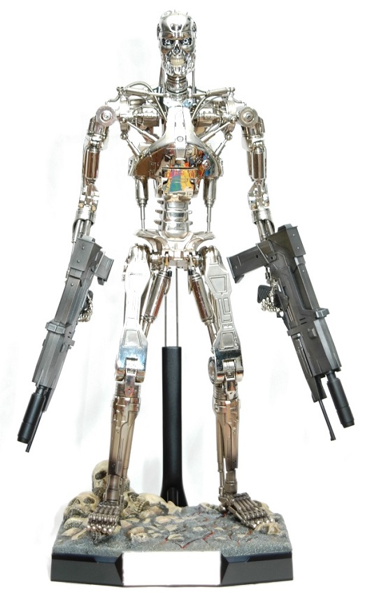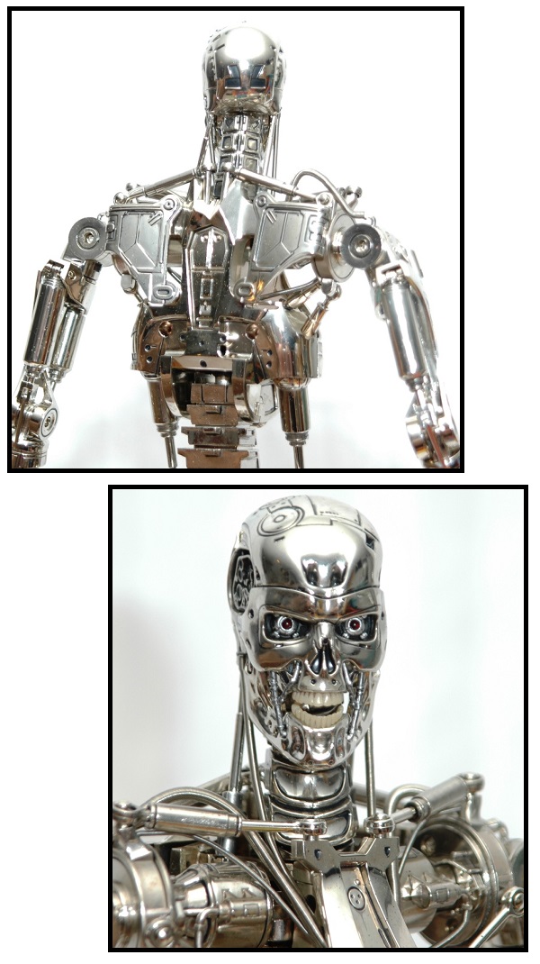 The full body save the LED eyes and the cream/white teeth feature electroplating. This gorgeous mirror finish across the diecast and plastic parts makes for the most realistic of Endoskeleton figures created so far.