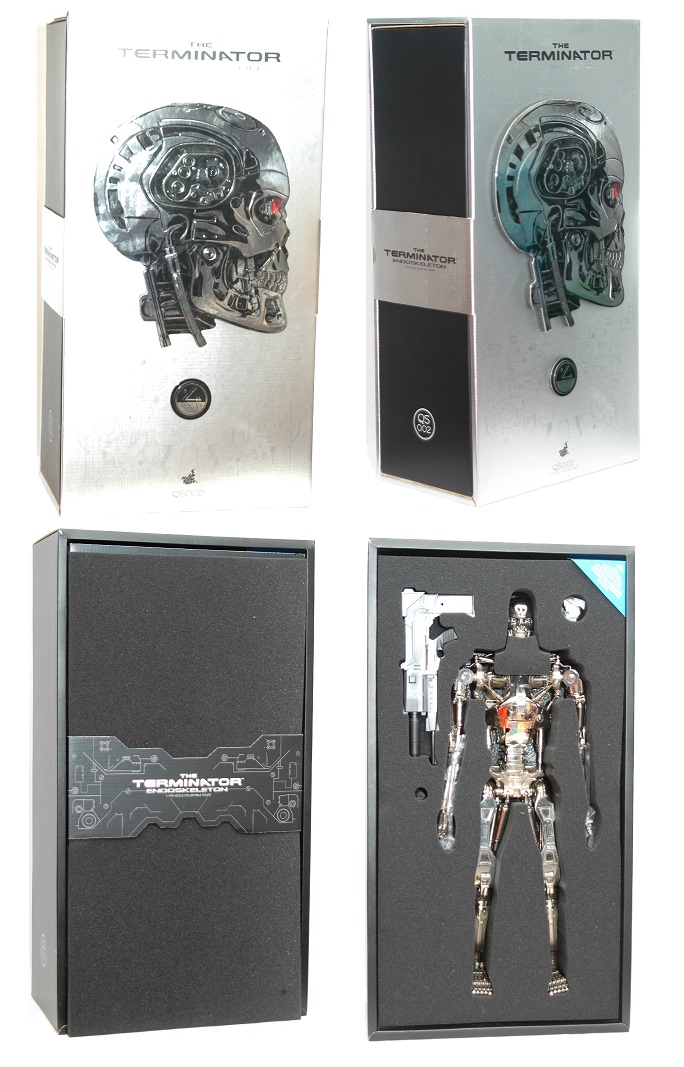 Packaged in a large, eye-catching silver and black box and featuring a die-cut Terminator Endoskeleton's head on the front, the Hot Toys QS002 figure looks amazing - even before you actually see it. Once the package is opened, one finds the 1/4 scale figure and accessories packaged inside the box, surrounded by durable foam to ensure they're protected. Under the first layer of foam, the figure base and the additional, exclusive plasma rifle accessory is packaged.