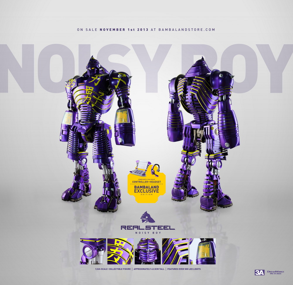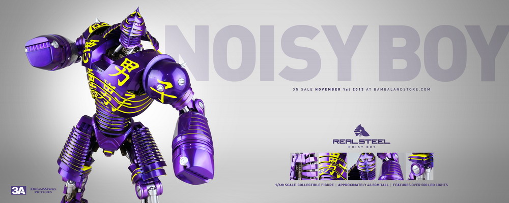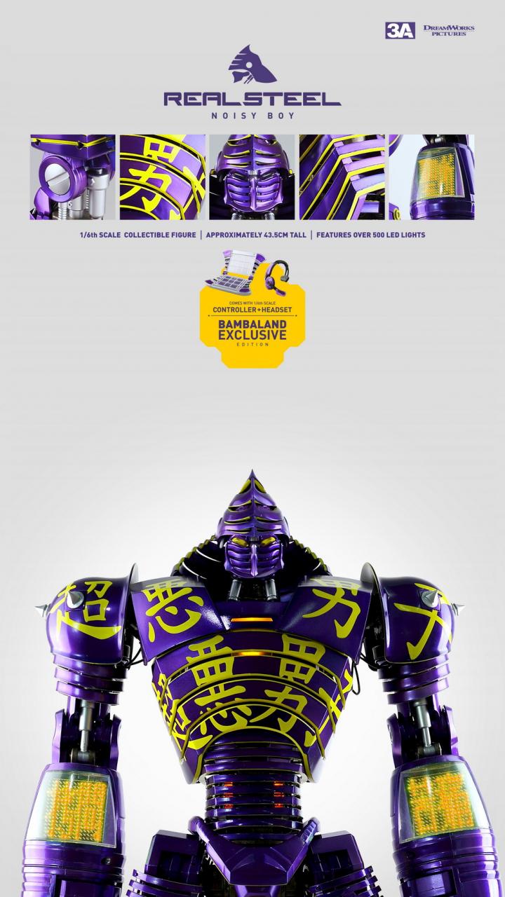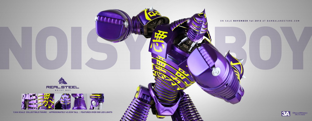 For their next 1:6th scale Real Steel action figure, 3A Toys is forgoing the realistic rust and grime they are known for on their toys and trying out something bright and shiny. Presenting "The Steel Samurai", "The Manga Mangler"... the polished purple brute of a 'bot NOISY BOY. This figure will feature over 500 LED lights!