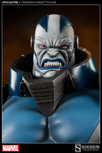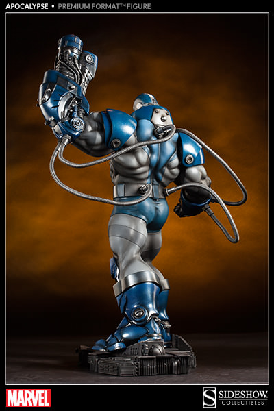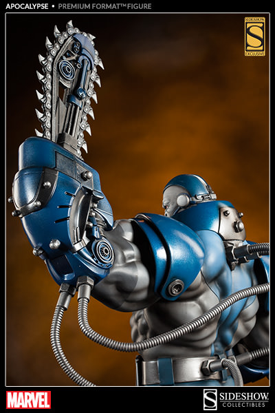 One of the first mutants and longtime adversary of the X-Men, Apocalypse is presented in his ghastly blue and grey color combination and prominent 'A' belt. The merciless bio-mechanical supervillain glowers down at all unworthy opponents, using his psionic shape-shifting abilities to wield a massive plasma laser cannon above his head, or with the additional Sideshow Exclusive accessory, a tremendous bladed saw arm.