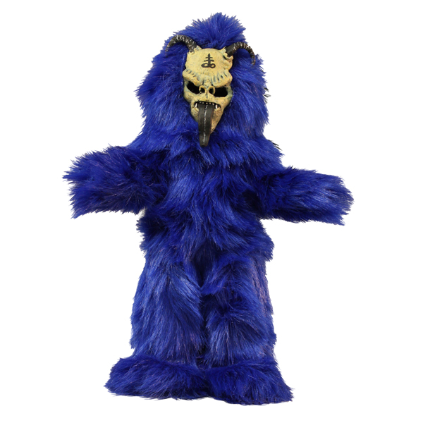 The one-of-a-kind Blue Krampus has been randomly packed in one of the 333 Holiday Mystery Boxes (available at mezcotoyz.com). Each Holiday Mystery Boxes will contain a full size 10 inch Living Dead Doll or another Mezco item, and one of those boxes contains the one-of-a-kind Blue Krampus. This one-of a-kind Blue Krampus features an a weathered bone colored mask with vibrant, icy blue fur.