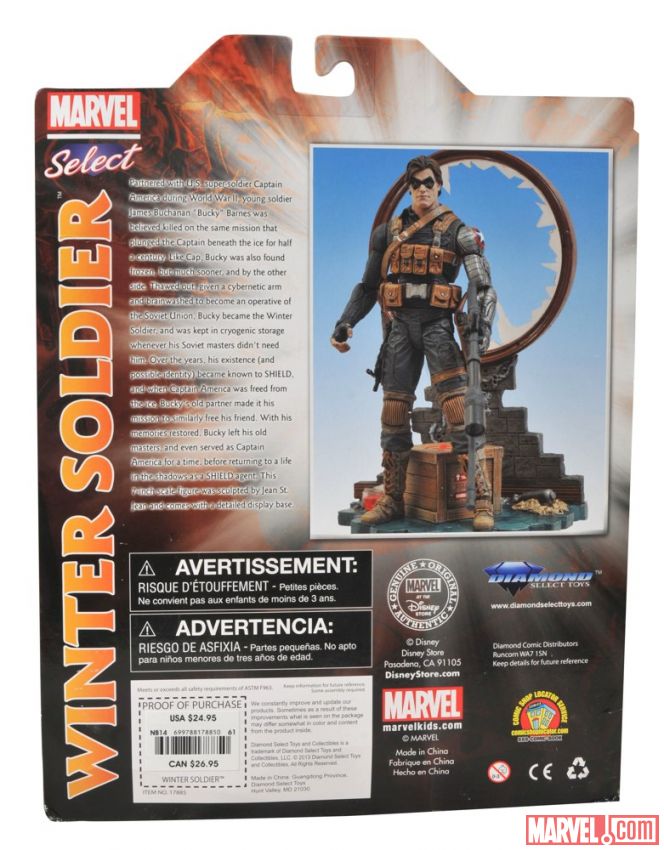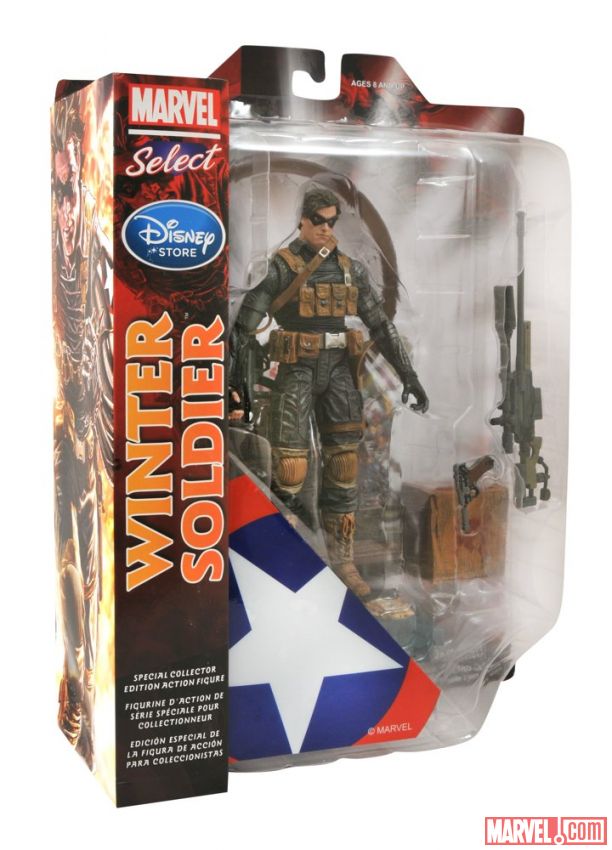 Diamond Select announces, via Marvel.com, that the Winter Soldier will be the next comic-based Marvel Select figure to hit the Disney Store. Sculpted by Jean St. Jean, the comic-based Marvel Select Winter Soldier action figure will be exclusively available at the Disney Store, DisneyStore.com and MarvelStore.com starting in mid-December. The approximately seven-inch figure has 16 points of articulation and comes with a pistol, machine gun and sniper rifle as well as a shattered window display base.