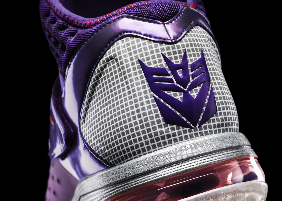 The Nike CJ81 Megatron Trainer’s purple upper gives the shoe a robotic, armored look, while the red accents refer back to the secondary color of the action figure. Under the forefoot strap, Johnson’s favorite Megatron quote, “Show no mercy,” appears. It’s a reminder of the athletic mindset needed to succeed at the highest level, and the perseverance required to rise to the top. The metallic silver heel of the trainer carries a classic Transformers grid pattern as well as a bold, iconic Decepticon logo at center.
