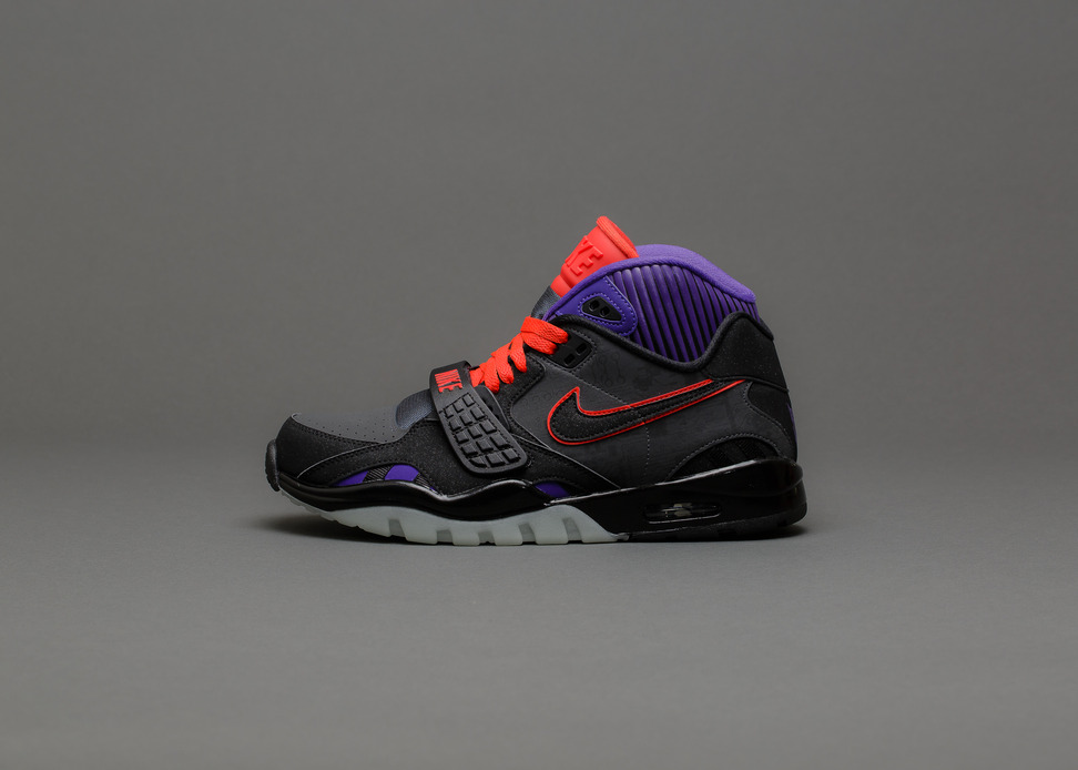 Complementing the Nike CJ81 Megatron Trainer Max, the Megatron Nike Air Trainer SC II draws more muted inspiration from the Transformers character. A tonal, reflective circuitry board pattern is featured on the medial and lateral quarter panels, and like the Nike CJ81 Megatron Trainer Max, the Decepticon logo appears welded at the heel. Premium Nubuck is used at the overlays, and a glow-in-the-dark outrigger punctuates the sole tooling. The final Transformers inspired flourish is a removable strap across the upper.