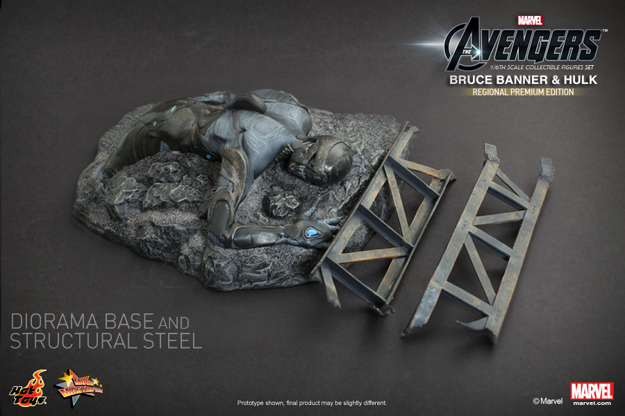 The 1:6 scale Bruce Banner figure can be purchased individually (details below - MMS229) or together with the Hulk in a deluxe two-pack (pictured top - MMS230). The two-pack includes a diorama base with fallen Chitauri footsoldier and two (2) pieces of metal-like structural steel.