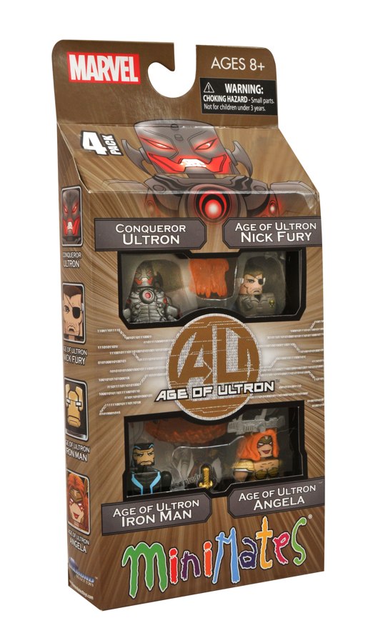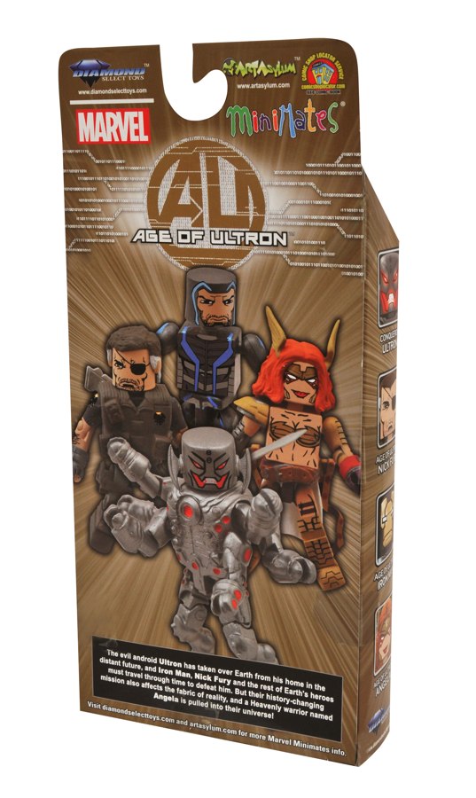 Tomorrow (12-4), the newest set of Marvel Minimates hits comic shops and specialty stores, and it’s come all the way form the Age of Ultron. Depicting the tyrannical robot Ultron as he appeared on the covers of the Age of Ultron maxi-series, this set of 2-inch Mini-figures also comes packaged with A.O.U. versions of Iron Man and Nick Fury, as well as the first-ever Minimate of Neil Gaiman’s supernatural comic character Angela. Angela comes with a sword, Iron Man has a removable helmet ad boot jets, Nick Fury has a rifle and jet pack, and Ultron sports six fully poseable arms.