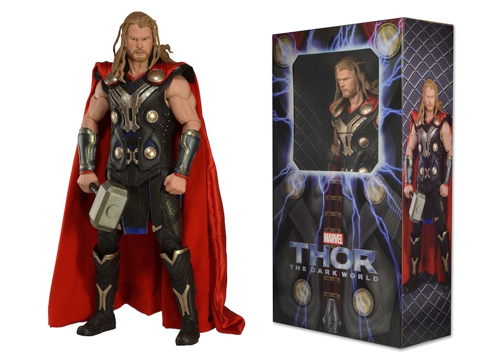 From Dark World, the sequel to 2011's Thor, comes NECA's 18" tall version of the Viking God, THOR. Featuring a lifelike portrait of actor Chris Hemsworth, Thor wears his latest Dark World costume and comes complete with his mighty hammer Mjolnir. Featuring nearly 30 points of articulation and a soft fabric cape. Window box packaging.