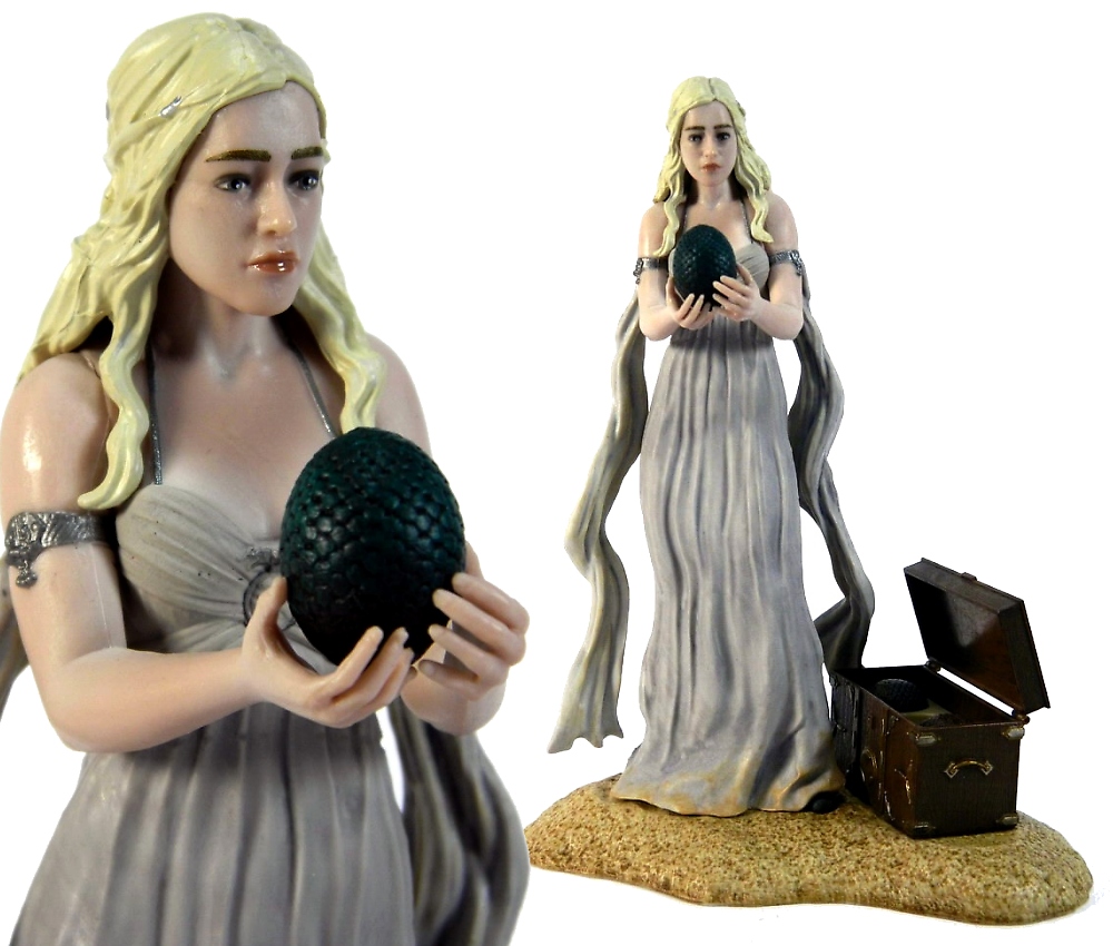 As mentioned in our interview with Dark Horse HERE, there are no immediate plans for Game of Thrones figure variants or exclusive. That's a shame, as Daenerys lends herself so well to multiple designs, the most obvious choice being a figure with newly hatched baby dragons. As is, Dark Horse chose a very pivotal look for the ruler of House Targaryen: Daenerys with her trio of precious dragon eggs. Her acquisition of the eggs is a major turning point for the character and is beautifully rendered here in plastic form. Daenerys stands 7 1/2 inches tall on her sandy base, an element that is permanently attached to the figure. While this may bother some who wish to display her in a different environment, I for one like it. The base for these figures not only provides solid stability, but they add more individual identity to each character. Like a statue, the environmental bases compliment the figures. And when was the last time you saw a figure even come with a base?