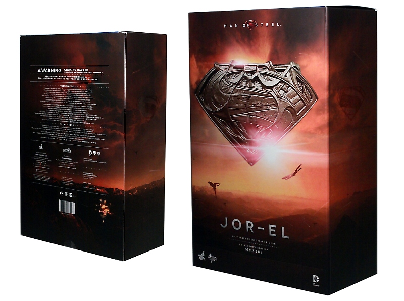 The box for Jor-El is much like the packaging for Superman and other Hot Toys releases. The art for Jor-El showcases Krypton on its final days but no other photographs of the character exist elsewhere. The box contains a front flap that is contained with a magnet and opening it reveals the figure inside. The figure and its base and accessories are well contained in many layers of plastic trays. This method saves space and yet also keeps all contents from moving about inside.