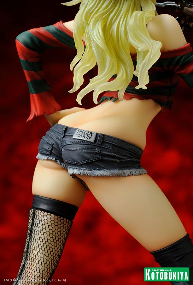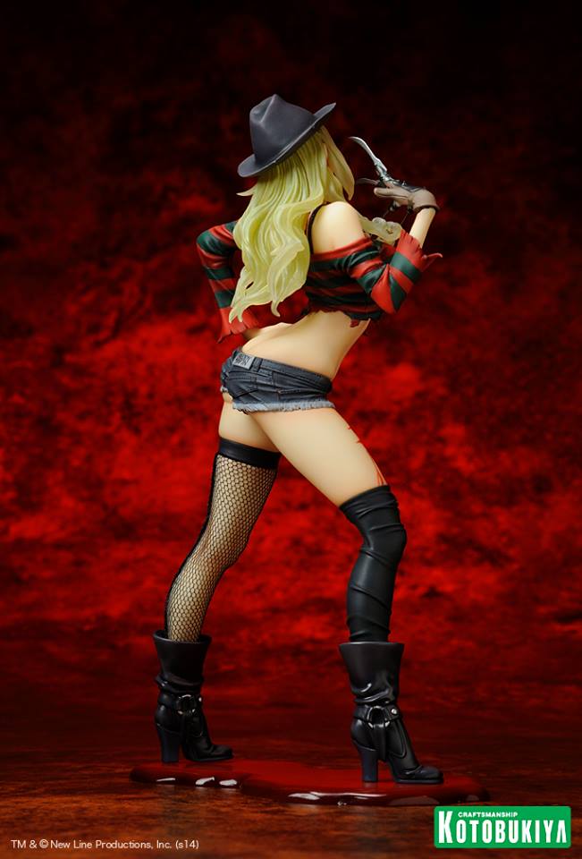 This new Freddy may wear the same iconic striped sweater, hat, and bladed glove, but that’s where the similarities end. A blonde vixen, this Krueger is a beauty with torn clothing, mismatched stockings, and even lacy undergarments peeking out from under her sweater! Freddy leans forward seductively, one hand on her hip and her iconic glove raised next to her face.