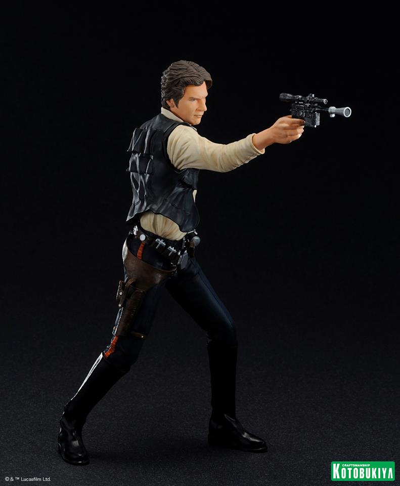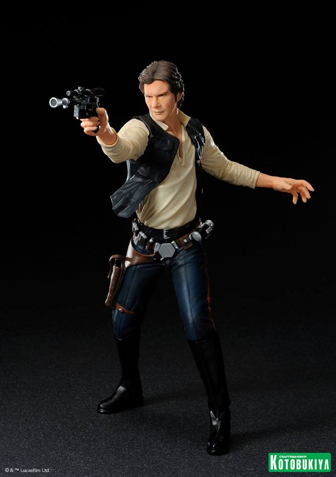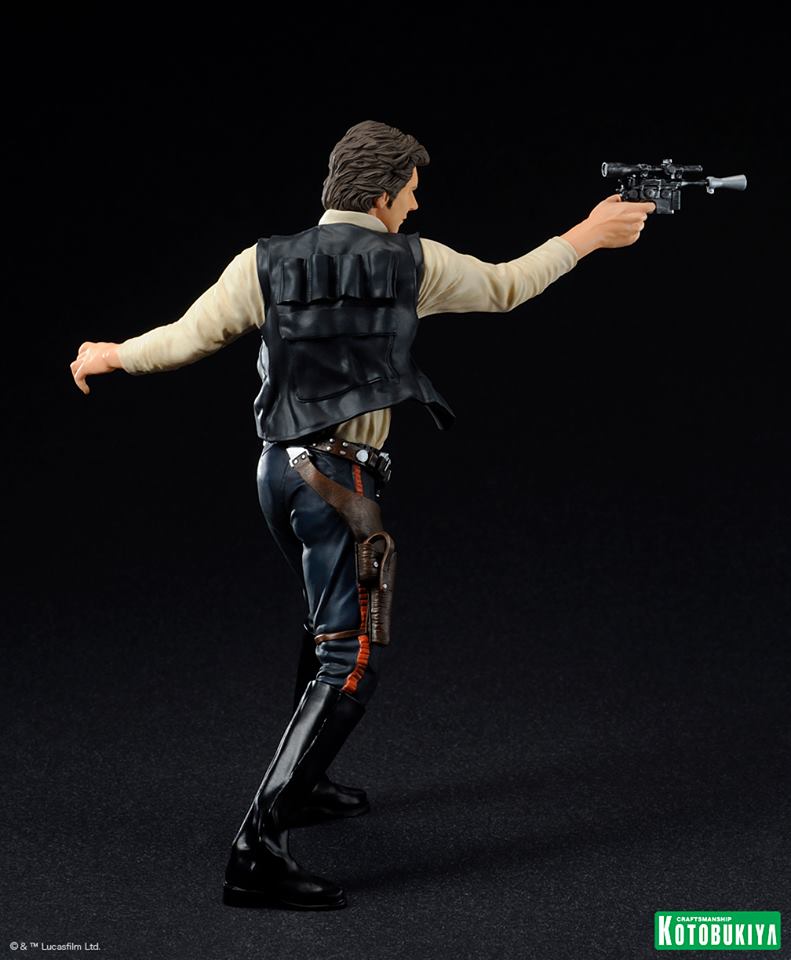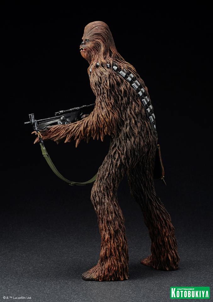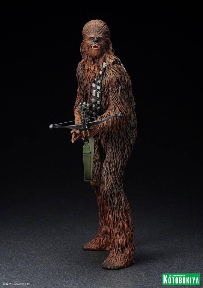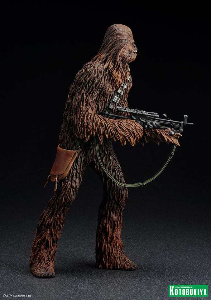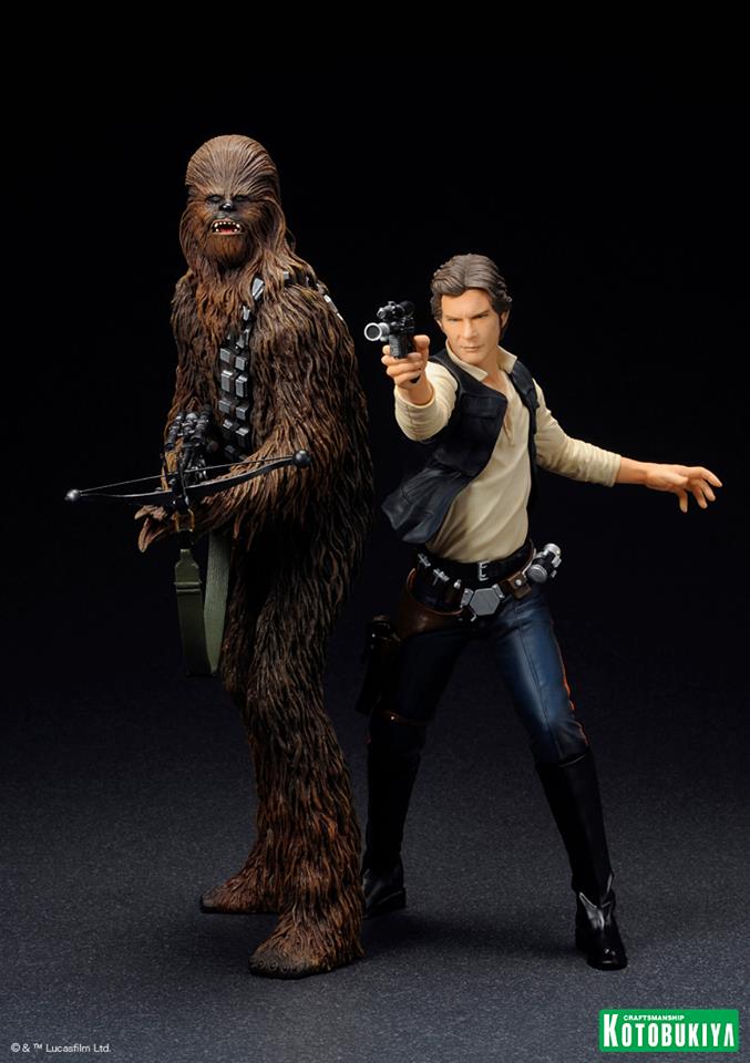 ARTFX+ Statues are fun-to-assemble pre-painted snap-fit kits that can be easily put together in seconds without glue or modeling skill. Han Solo stands just over 7 inches tall and Chewbacca over 8 inches (1/10th scale) atop their included display bases; magnets in their feet provide extra stability.