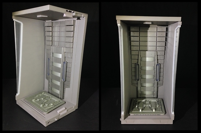 The diorama consist of 4 separate parts (main silo, side panels and plastic screen) and requires some minor assembly to put together. The diorama features several different lighting elements throughout the structure providing varying lighting configurations. The diorama requires AA and AAA batteries to function but they are not included with the set. The Iron Man Hall of Armor diorama features:
