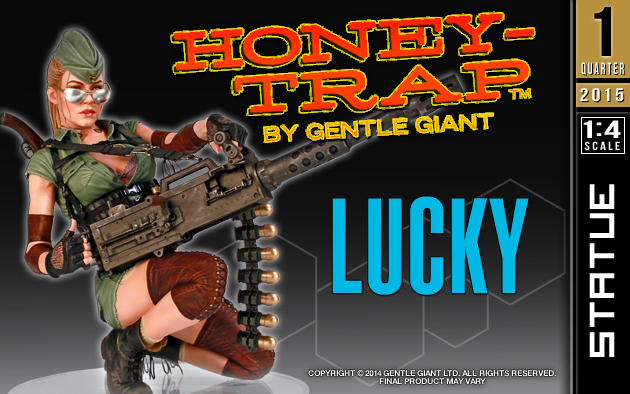 Gentle Giant Ltd. is proud to bring you the next statue in our exciting new Honey Trap line, Lucky! This gorgeous 18” scale statue has been digitally sculpted by the master artisans at Gentle Giant Ltd. and cold-cast using only the highest quality polystone, then integrated with a variety of mixed media. From each individually-crafted round in her grenade launcher to her signature aviator sunglasses, this lovingly crafted piece features an unprecedented level of detail.