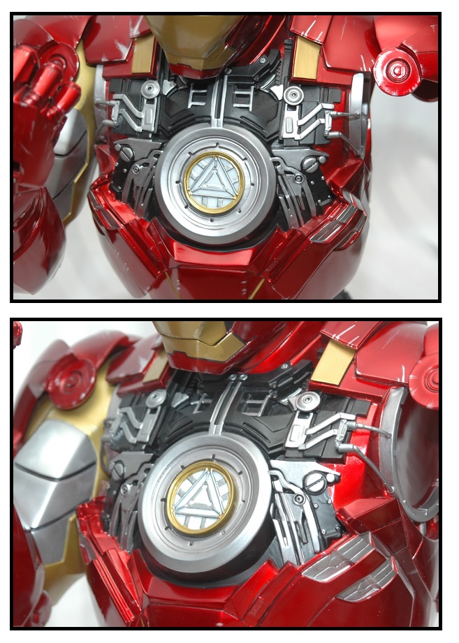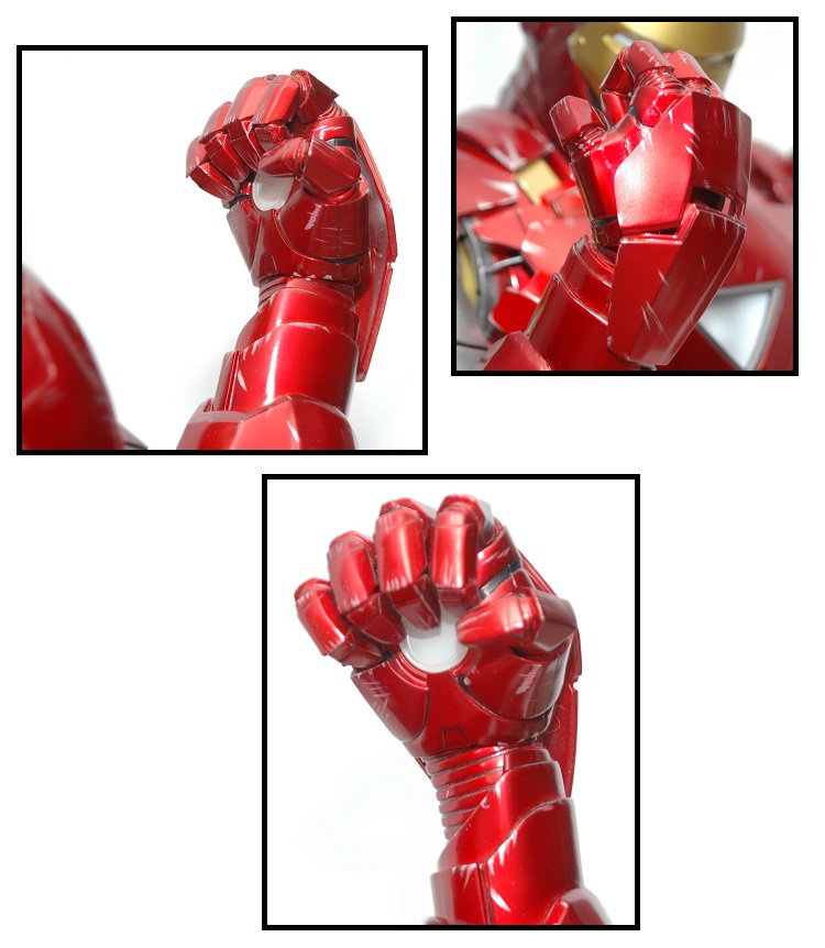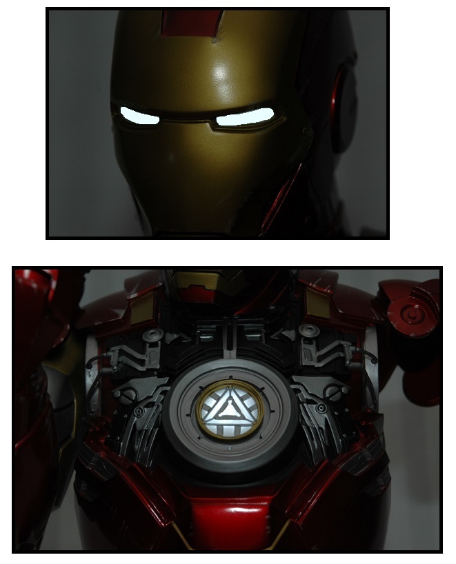 All three brightly shine when engaged and light up well, providing an impressive display. Something worth noting is the chest light -which represents the ARC reactor - shines brightly not just with the chest armor plate off, but also through the removable chest piece thanks to a translucent piece of durable plastic. This allows the ARC reactor light to be visible both with and without the chest plate in place, something collectors will appreciate for multiple display options.