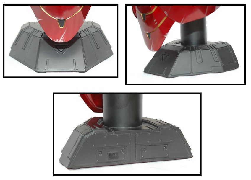 The Iron Man - Mark VI Legendary Scale Bust includes not one, not two, but three unique light up features: the eyes, the palm (repulsor ray) and the chest ARC reactor. Each is controlled by a single "on/off" switch on the back of the bust's base (below).