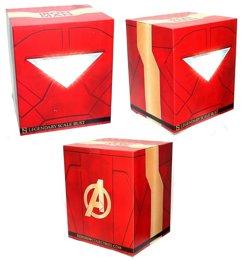 Like other Legendary Scale busts and many of Sideshow's fine statues, the Iron Man - Mark VI Legendary Scale Bust comes in a large, durable and impressively designed package featuring the "Avengers" logo on one side, an eye-catching triangle-shaped ARC reactor on the other and the red and yellow colors of the Iron Man armor. The package features a simple, elegant design that perfectly complements the contents inside and teases as to what's in store without ever having to open the box. Inside, the single-piece bust, removable chest plate, and 3 'AA' batteries are all securely held in place thanks to a two-piece, form-fitting and durable Styrofoam interior.