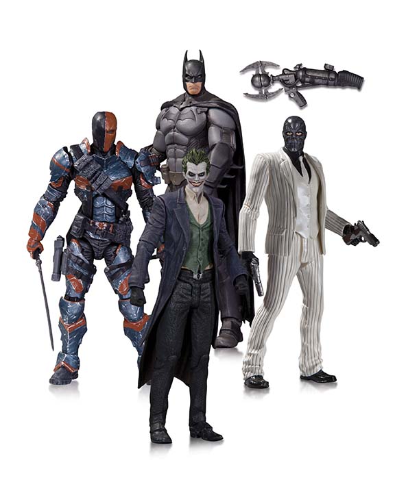 Batman is joined by three of his deadliest adversaries, Deathstroke, Black Mask and The Jokerin the latest 4-Pack based on their designs from the hit video game Batman: Arkham Origins. Featuring new Batman hand sculpt and Remote Claw accessory!