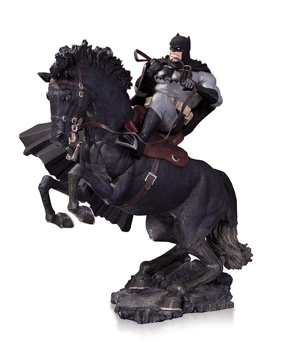 Mounted on a horse as black as night, the caped crusader rallies the troops in the statue inspired by Frank Miller's legendary work, BATMAN: THE DARK KNIGHT RETURNS! Don't miss your chance to get this limited edition run commemorating the Year of the Horse with all new Batman deco! Limited Edition of 1000. Measures Approximately 14" Tall.