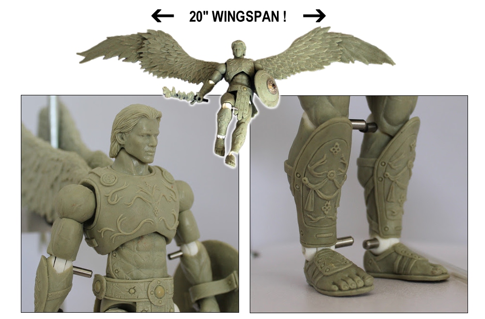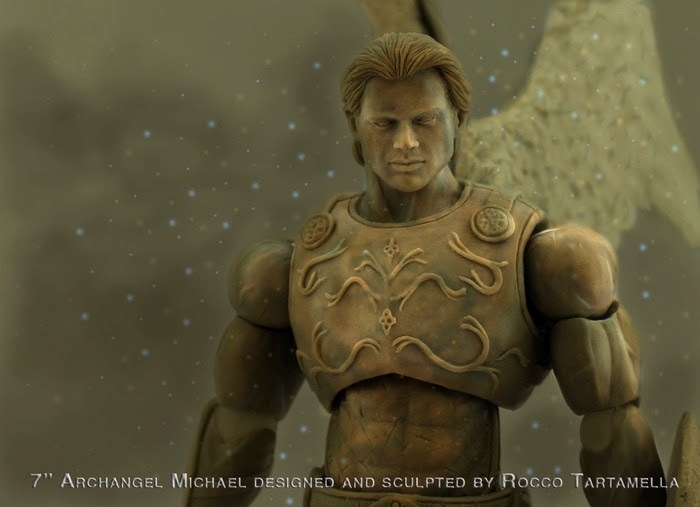 Rocco Tartamella - a professional sculptor and toy designer with over 15 years experience in the industry - presents the ARCHANGEL MICHAEL action figure, the first in a planned line of Angels and Demons action figures. In scale with many popular action figures, Archangel Michael stands a heroic 7-inches tall. The figure stars some 30 points of articulation, including ball-jointed/ pivot wings that can swing open to approximately 20-inches across! Archangel Michael takes the fight against the demons with ornately sculpted armor (to be painted bronze with silver highlights), a 10-inch long spear, highly detailed shield and a powerful flame sword, which Rocco's plans on casting in clear amber to give the appearance of being on fire.