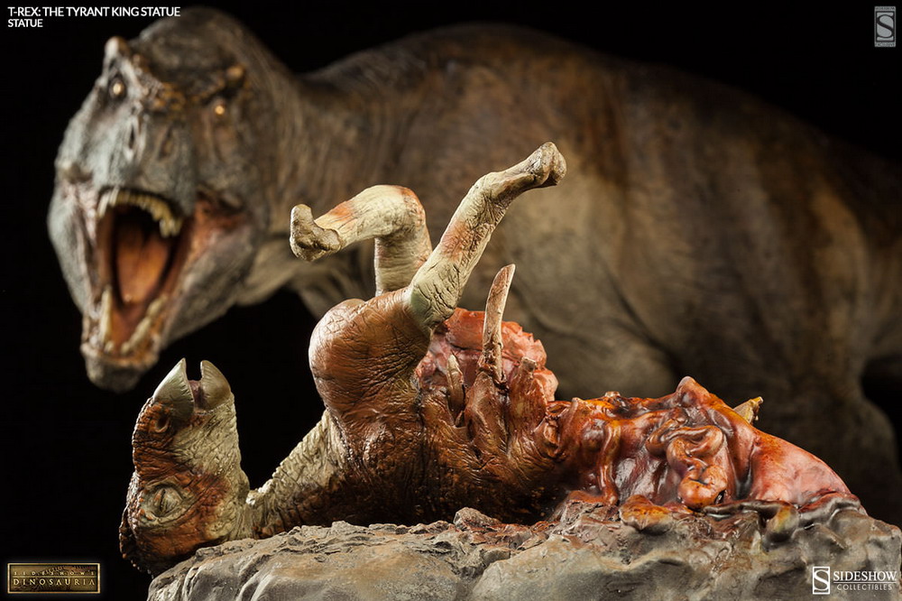 Designed with the insight of renowned paleoartists, the ravenous carnivore lunges forward with a ferocious roar, and with the addition of the Sideshow Exclusive, can be displayed triumphantly over the remains of his most recent prey (below).
