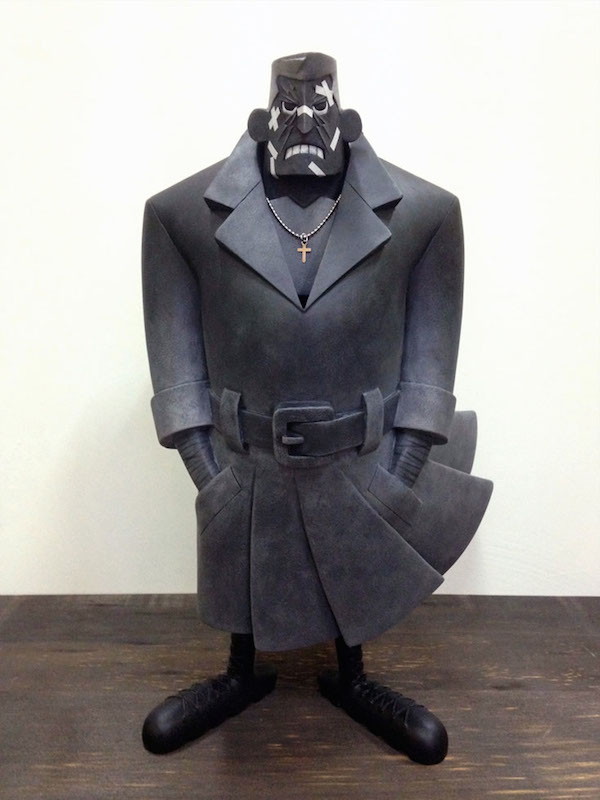 In the same spirit as his previous collaboration with Dark Horse (a vinyl figure of Mike Mignola’s Hellboy) or his Nike-commissioned statue of Michael Jordan, So favors a humorous and cartoonish approach over realism. While Marv is depicted in his customary trench coat, he has been transformed through Eric So’s unique approach to angles and features. Still, the influence of Frank Miller’s signature style shines through.