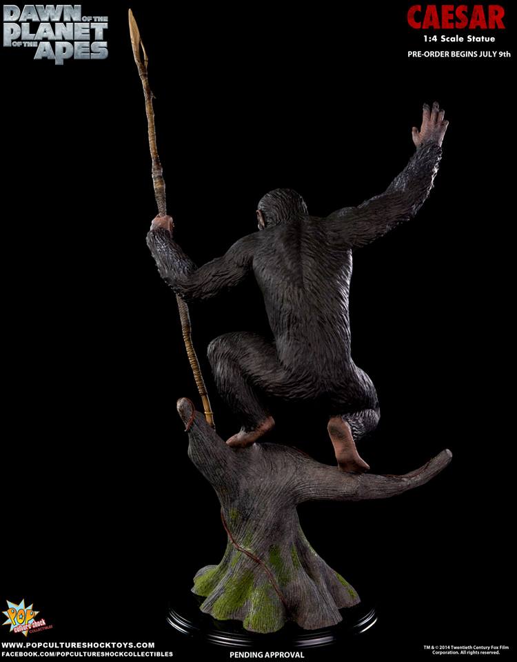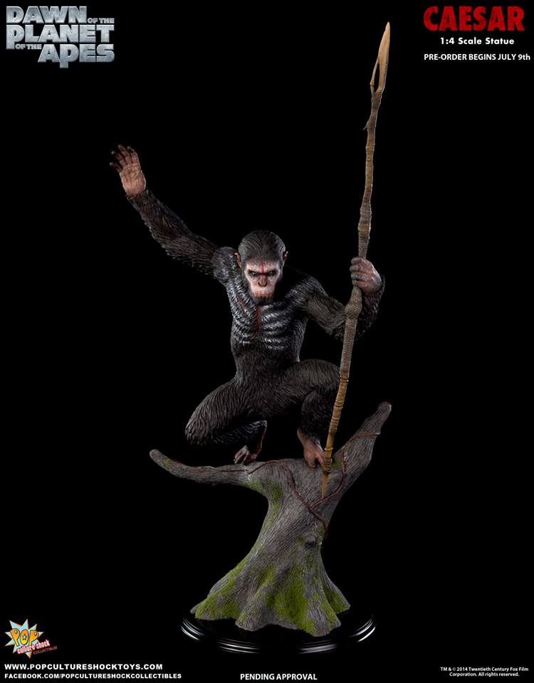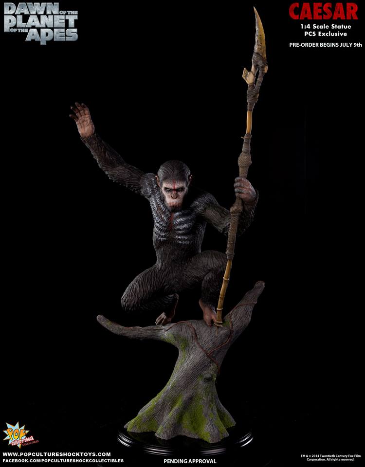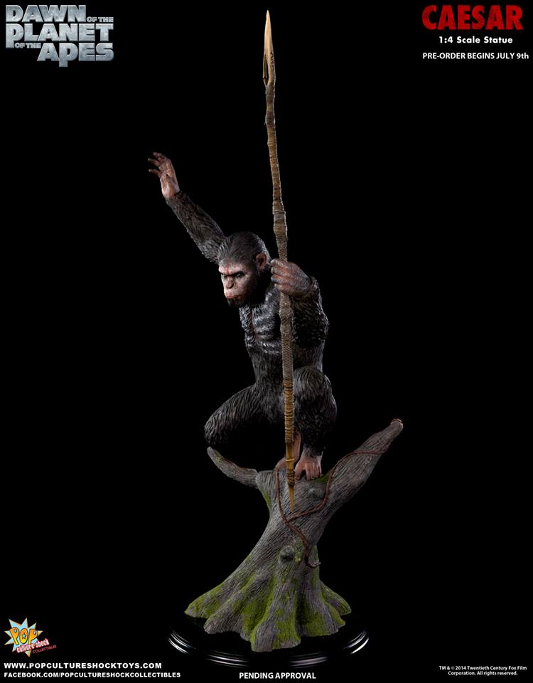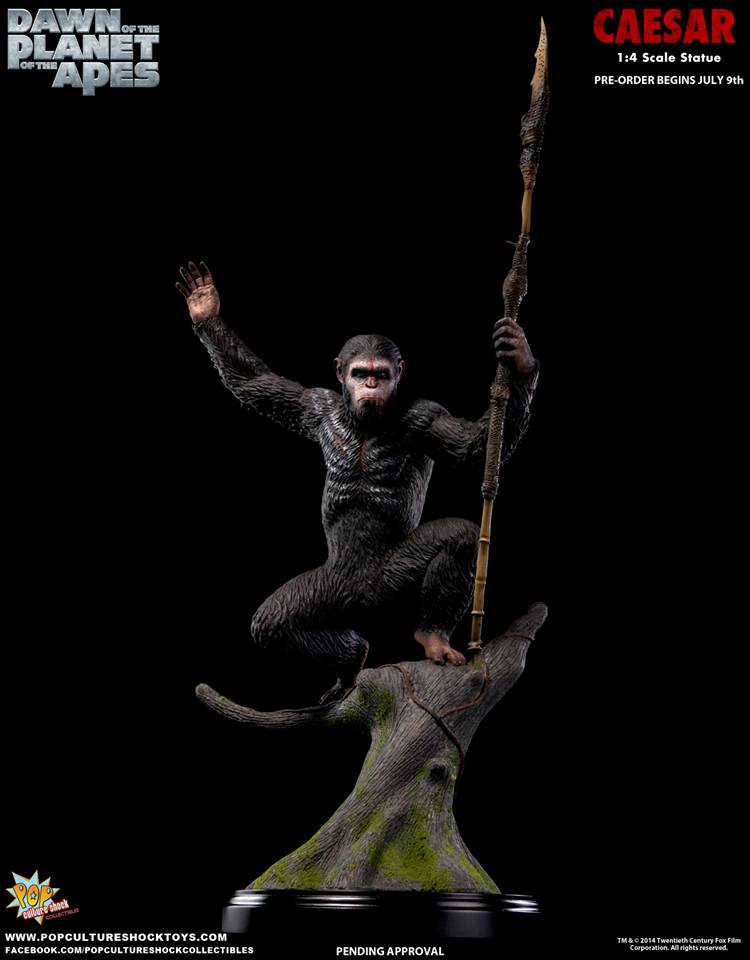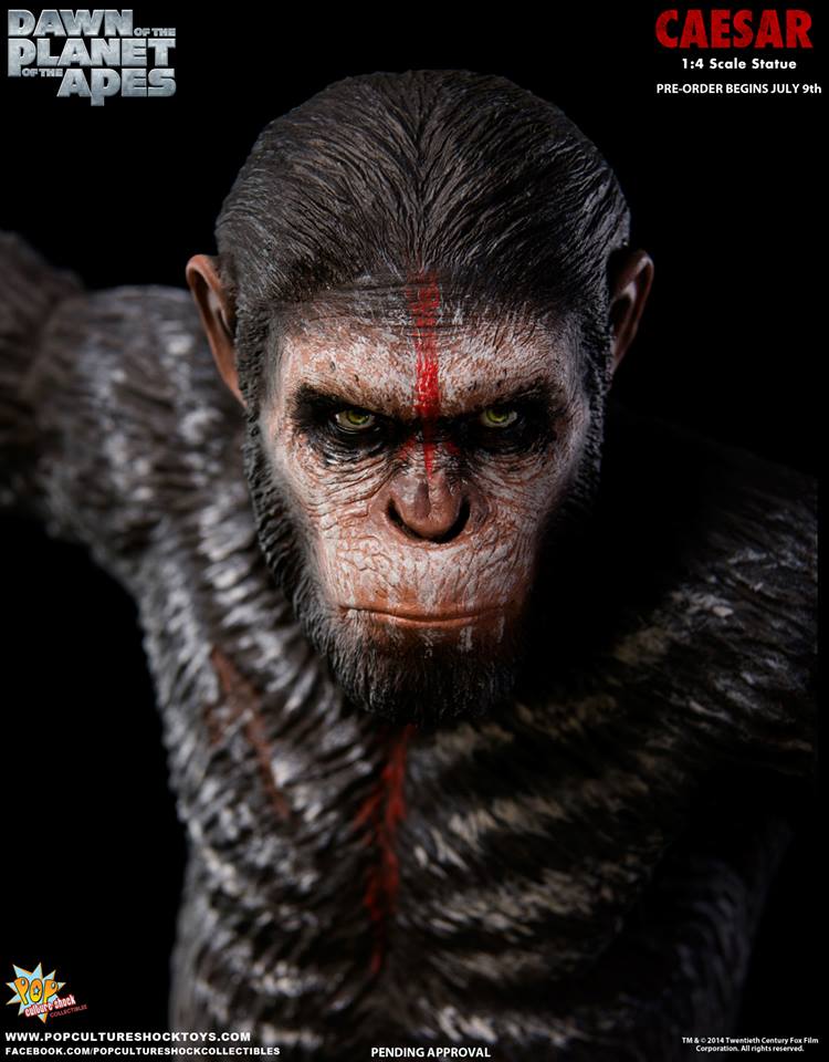 As announced last month, Pop Culture Shock's newest license is DAWN OF THE PLANET OF THE APES, thier first release being a 1:4 scale statue of Caesar. Pre-orders for this simian warrior start July 9th at 5pm PST. Available through popcultureshocktoys.com, two versions will be offered: