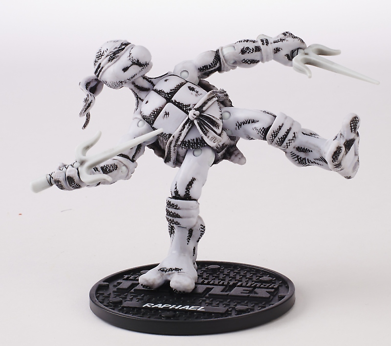 Based on original comic drawings, this figure is decorated in black and white and features his signature weapon. The figure stands on a sewer lid with Raphael engraved.