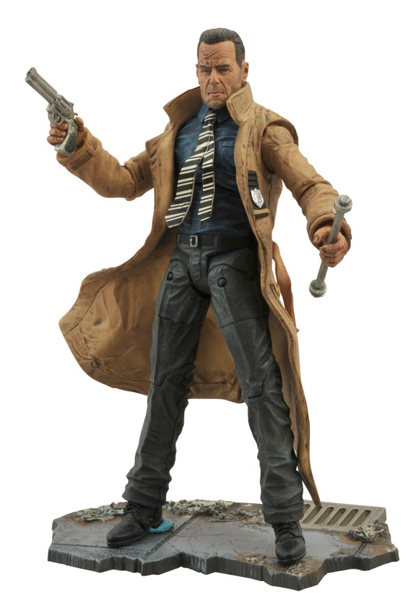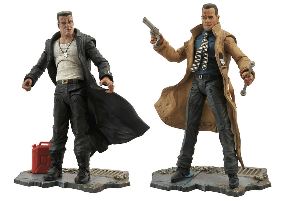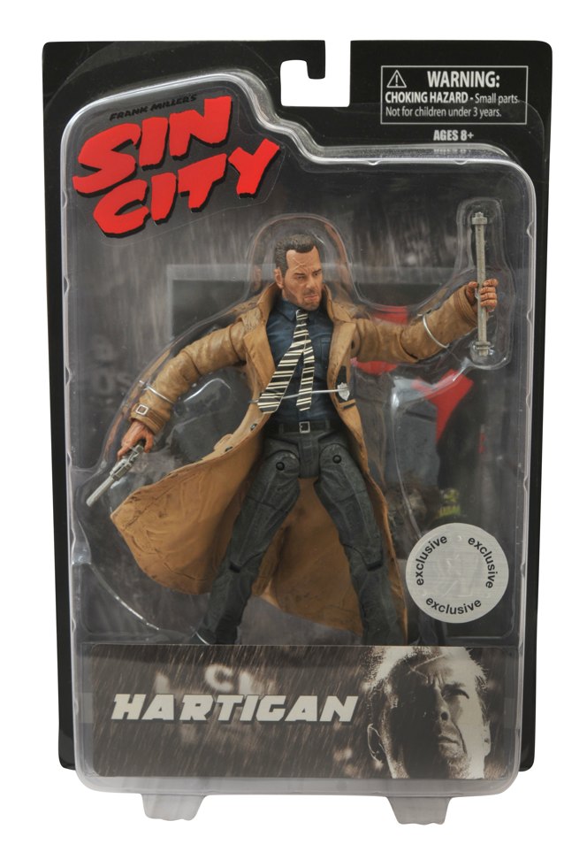 For those who prefer their neo-noir in living color, Marv (Mickey Rourke) and Hartigan (Bruce Willis) are now a pair of full-color action figures in Toys"R"Us stores. Packaged in more streamlined packaging, with smaller street bases, Marv and Hartigan each include their unique accessories and the same high level of articulation. Both the black-and-white Select figures and color Toys"R"Us figures were sculpted by Jean St. Jean.