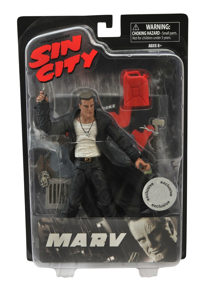 Sin City: A Dame to Kill For is headed to theaters, and the first assortment of Sin City Select action figures, based on the original 2005 feature film, is in stores now. Captured in the film's trademark black-and-white, main characters Marv, Hartigan and Nancy each feature multiple points of articulation, multiple accessories and a detailed diorama base. And now Diamond Select Toys announces a pair of exclusive figures only available at Toys"R"Us!