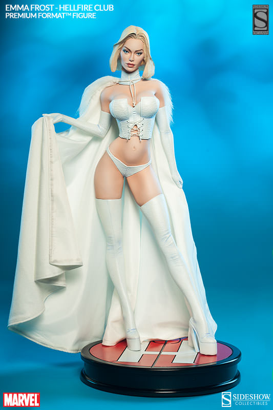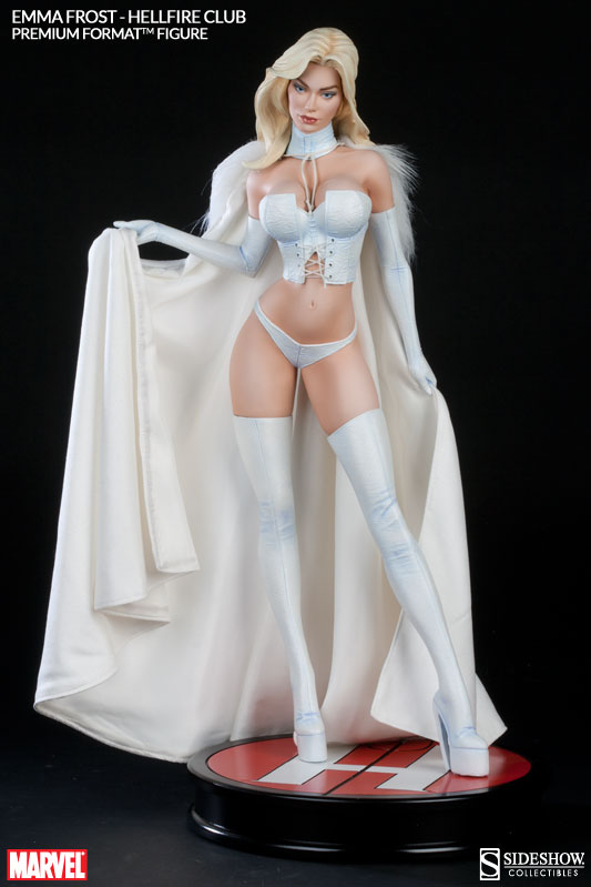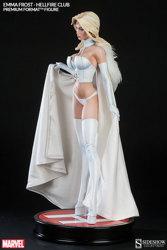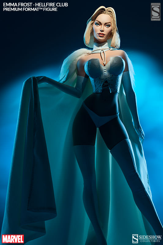 Sideshow presents their newest Marvel Premium Format Figure: the White Queen, Emma Frost. Beautifully sculpted in 1:4 scale, Emma Frost cooly assumes her position as the White Queen atop a Hellfire Club themed base, boasting supreme confidence and a quiet mystique. Clearly calculating her next move, Emma’s piercing blue eyes reveal even more than her scant attire. Dressed to the nines in her provocative all-white corset, thigh-high boots, and fur-trimmed cape, the drop dead gorgeous White Queen is not to be underestimated.