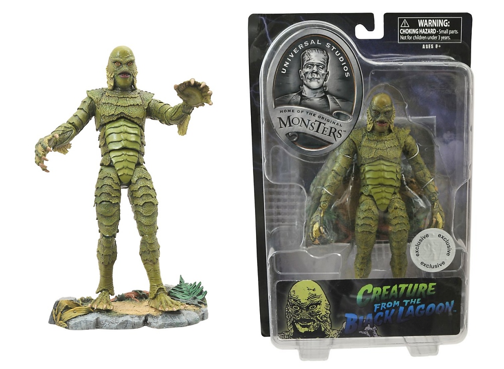Currently at Toys "R" Us are two brand-new 7-inch-scale action figures: Frankenstein's Monster as he appears in Son of Frankenstein, and a super-poseable version of the Creature from the Black Lagoon. Both feature entirely new sculpts by Jean St. Jean, and both come packaged on a blister card with a small display base. Additionally, the Monster comes with the prosthetic arm of Inspector Krogh.