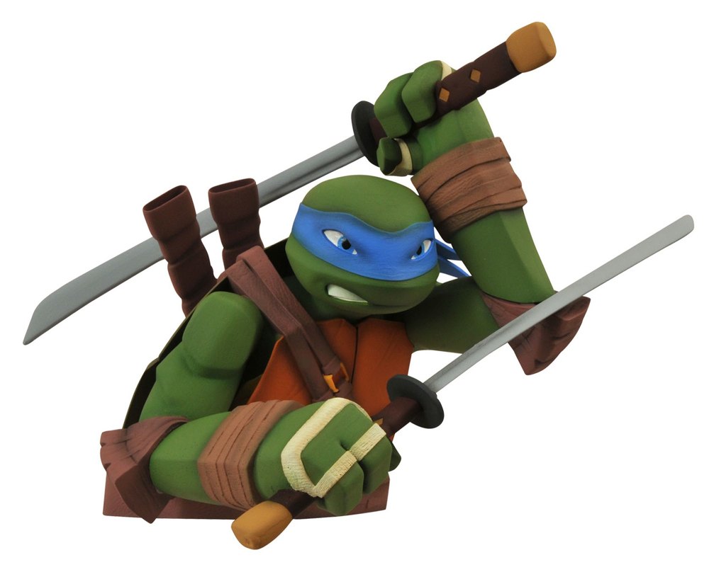 Measuring approximately 7-8 inches tall, these four vinyl bust banks of Leonardo, Michelangelo, Donatello and Raphael are based on their most recent Nickelodeon cartoon appearances, and each wields his trademark weapons. With a coin slot in the back and an access door on the bottom, you can save your money for a rainy day -- or your next pizza craving!