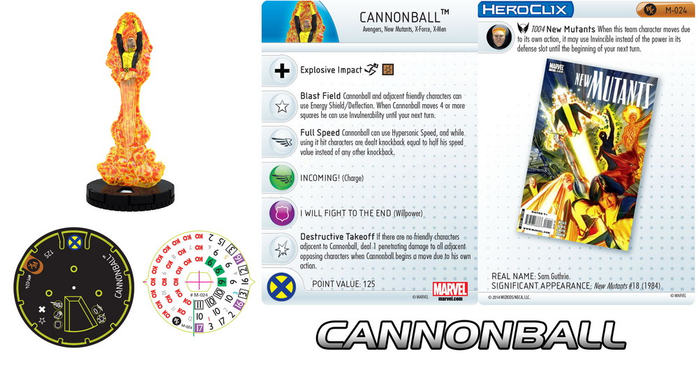 What we will show you today is the third member of the “Excalibur” monthly OP kit, the American mutant and member of the New Mutants Cannonball! Sam shares the same sculpt with his predecessor, an excellent take on his blasting mutant power that captures him in mid-flight and mid-energy field. The blast around him has a ton of billowing detail and Cannonball inside is fully 3D, sticking out of the energy in the front and the back. The previous leader of the New Mutants was 92 points, and this new experienced version is fully 33 points more expensive. He still has Flight and the X-Men team ability but loses the short range. His predecessor’s dial was all green and white special powers, while the new one changes things up a little bit. First off, he moves through and destroys blocking terrain, and the “Blast Field” trait gives him and adjacent allies Energy Shield/Deflection AND provides Cannonball with Invulnerability when he moves at least 4 squares! He’s slightly slower than before, but gets half a dial of a special power giving him Hypersonic Speed with super knockback before switching to regular Charge. There’s another vanilla attack track, though Sam has learned from his teachers and can land hits with better numbers. With his defense taken care of by the trait, Cannonball gets a few scattered clicks of Willpower, and a mid-dial special power deals penetrating damage to adjacent enemies when Sam moves and there are no allies to get in the way! The mutant is very team friendly with Avengers, New Mutants, X-Force, and X-Men keywords, and when attached to the New Mutants team base lets it use Invincible instead of its printed power after it moves.